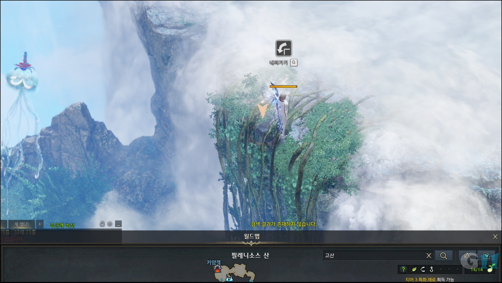 채집물은 월드맵[M]을 누르고 상단 검색 창에 채집물 이름을 검색하면 주변에 해당 채집물이 등장했는지 확인이 가능합니다. 범위는 맵 전체가 아닌 미니맵 상 보이는 지역의 채집물로 해당 채집물이 없으면 위와 같이 중앙 하단에 노란색으로 [검색 결과가 없습니다.]라고 나타나고 만약 있다면 해당 채집물이 깜빡거립니다.
