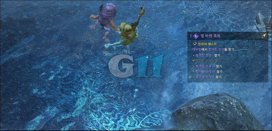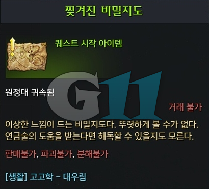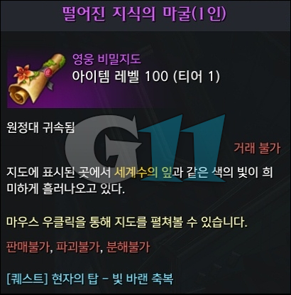 퀘스트는 대현자들과 대화를 한 뒤 대우림에서 찢겨진 조각을 찾아야 합니다. 위에서 확인한 고고학 포인트에서 고고학을 하다 보면 찢겨진 조각 1~5를 어렵지 않게 모두 획득할 수 있습니다. 모두 모아 대현자와 대화를 하면 퀘스트를 완료하고 보상으로 1인 비밀던전 '떨어진 지식의 마굴(1인)'을 획득합니다.