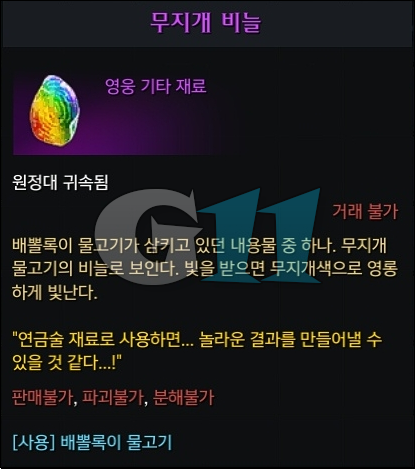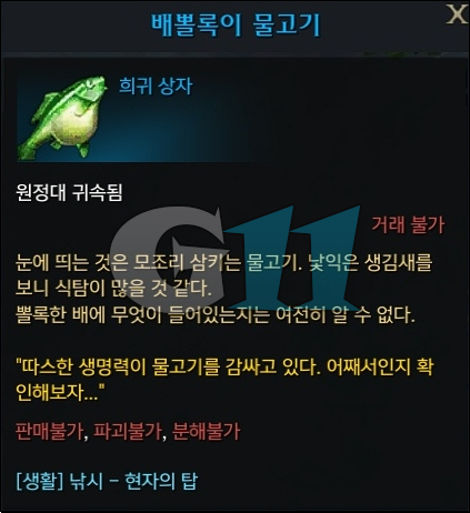 무지개 비늘은 현자의 탑에서 낚시를 하다 보면 낮은 확률로 배뽈록이 물고기를 낚을 수 있습니다. 획득한 배뽈록이 물고기를 사용하면 무지개 비늘을 획득합니다.