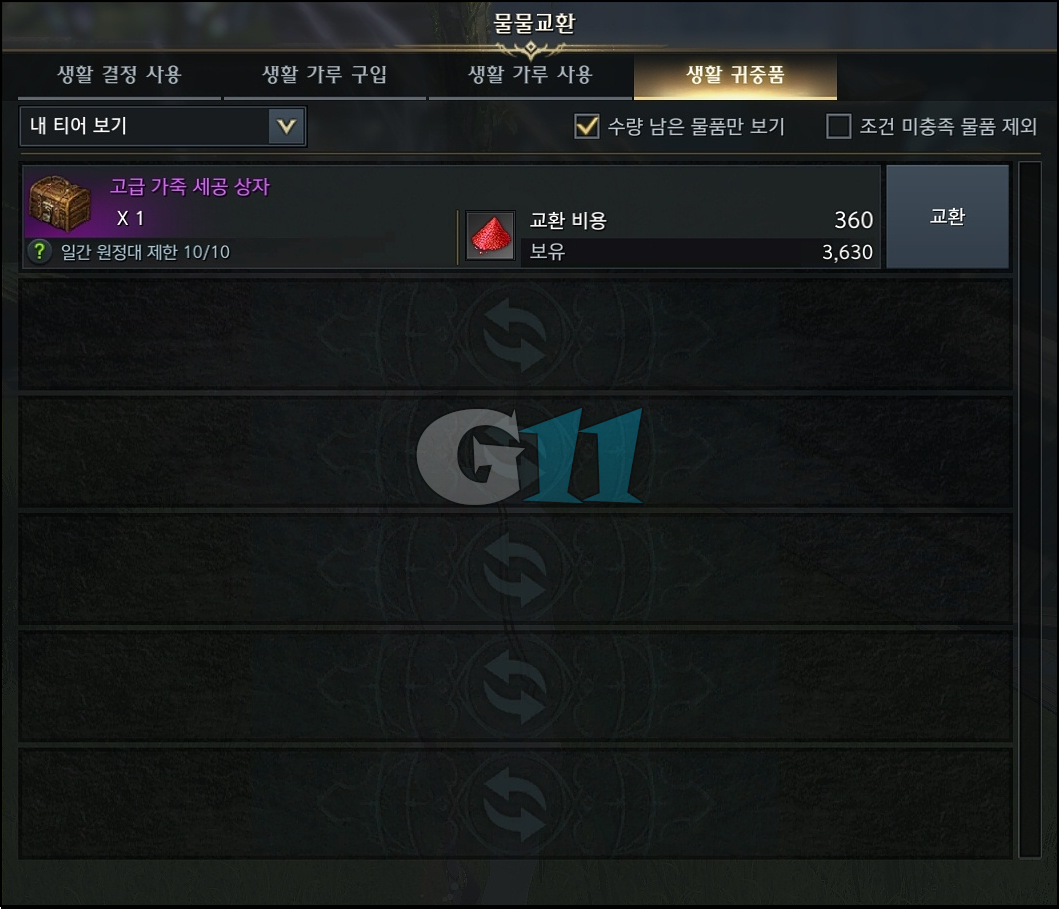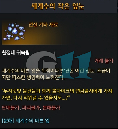 위에서 모은 세계수의 작은 잎눈, 무지개 비늘, 무지개 가죽, 무지개 정수와 500 골드를 사용해 다시 피어난 꽃망울로 교환할 수 있고 해당 아이템을 사용하면 세계수의 잎#109를 획득합니다.
