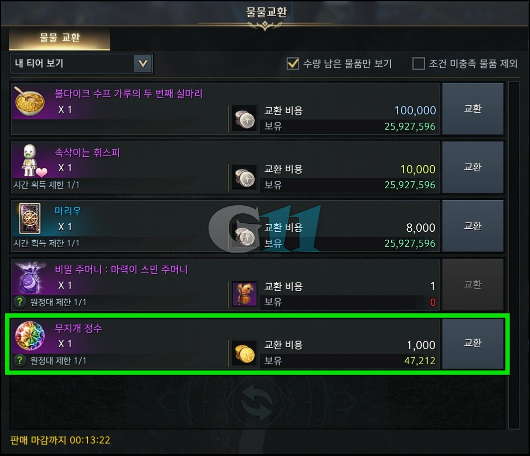 무지개 정수는 대우림에서 등장하는 떠돌이 상인을 통해 교환할 수 있습니다. 교환 비용으로 1,000 골드가 필요하니 미리 골드를 준비해 두세요.