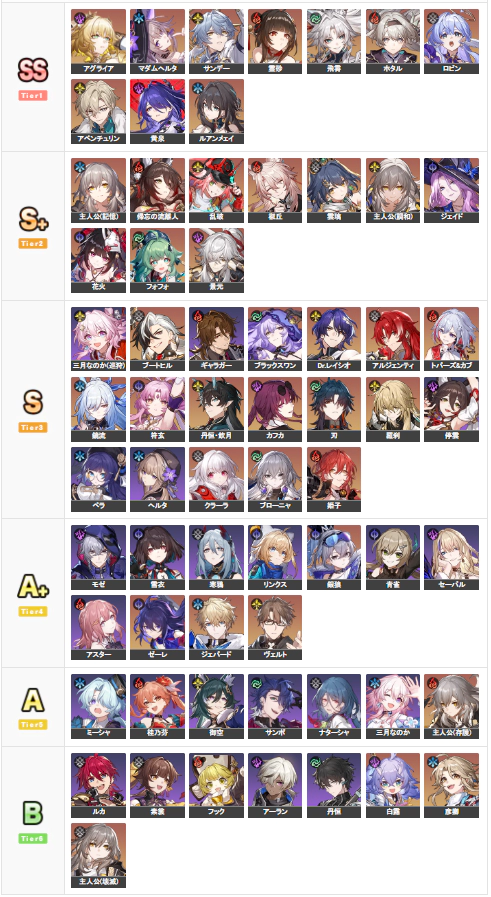 아래 티어는 덱 조합보다는 캐릭터의 성능만을 분류해 평가된 자료로 개인마다 기준이 다를 수 있습니다. 이 글은 붕괴 스타레일 디시 갤러리와 아카라이브 티어표, 일본 서버 데이터를 모두 참고한 글입니다.