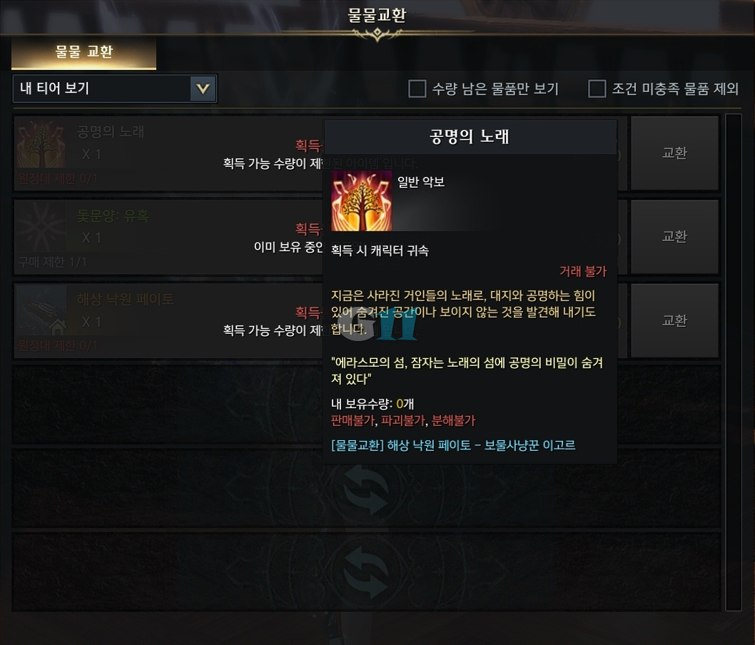 이고르에게 공명의 노래를 해적 주화 16,500개로 교환할 수 있습니다. 교환을 하면 아이템 창으로 공명의 노래 악보가 들어오며 이 아이템을 우클릭하면 공명의 노래를 연주할 수 있게 됩니다.