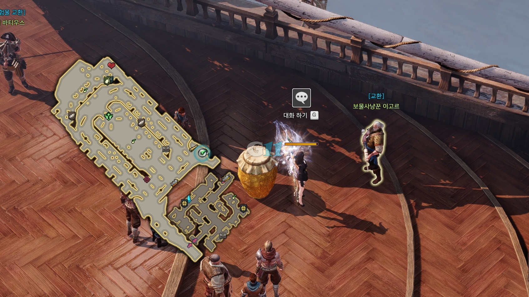 들어온 입구 기준 1시 방향 위로 걸어 올라가면 교환 '보물사냥꾼 이고르'가 있습니다.