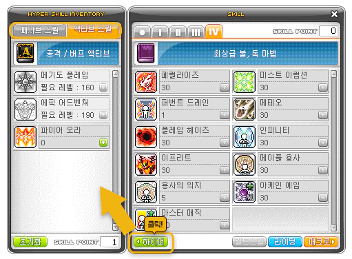하이퍼 스킬은 140 레벨을 달성하면 습득이 가능하고 스킬창[K]을 눌러 확인할 수 있습니다. 140, 150, 165, 190 레벨에서 스킬 포인트를 획득할 수 있으며 스킬 포인트를 사용해 패시브 스킬을 습득할 수 있습니다. 액티브 스킬은 140, 160, 190 레벨에 스킬이 각각 해제되어 습득할 수 있습니다.