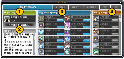 - 본인의 링크 스킬을 확인할 수 있으며 전수받고 있는 캐릭터 확인 가능