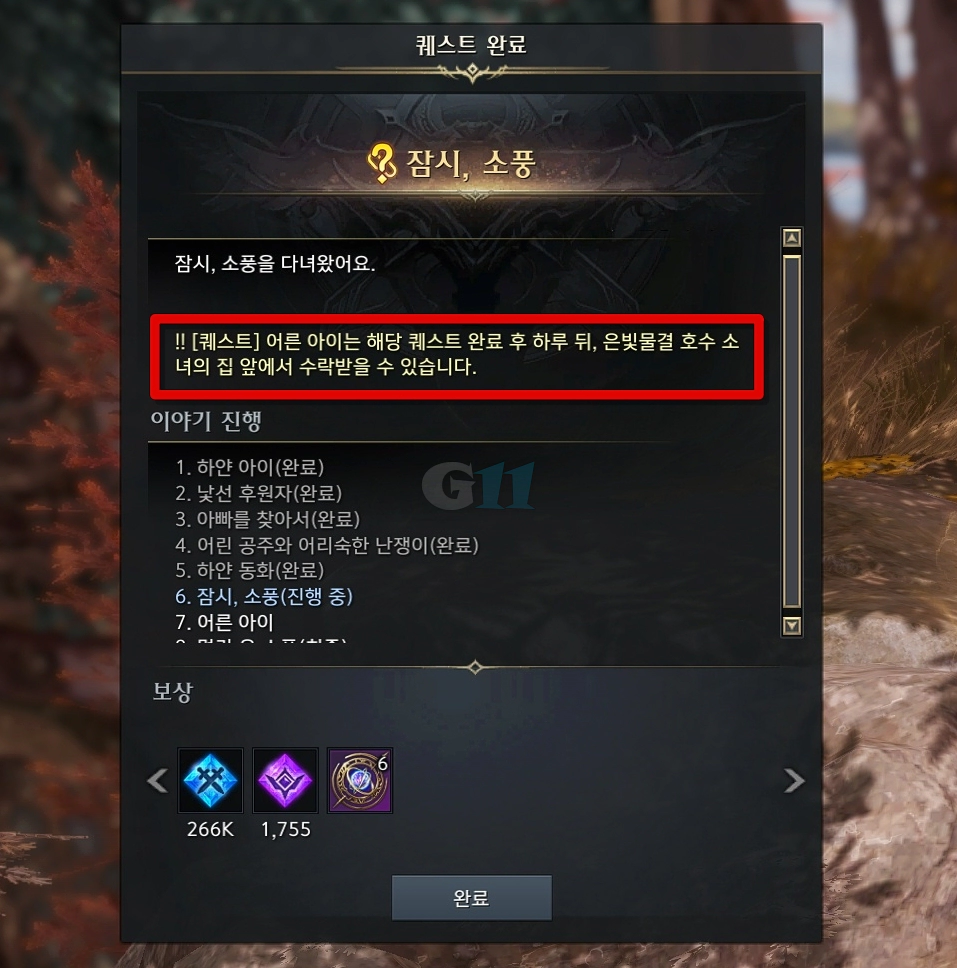'잠시, 소풍' 퀘스트를 완료하고 '어른 아이' 퀘스트는 하루 뒤 로헨델 은빛물결 호수 소녀의 집 앞에서 진행이 가능합니다.