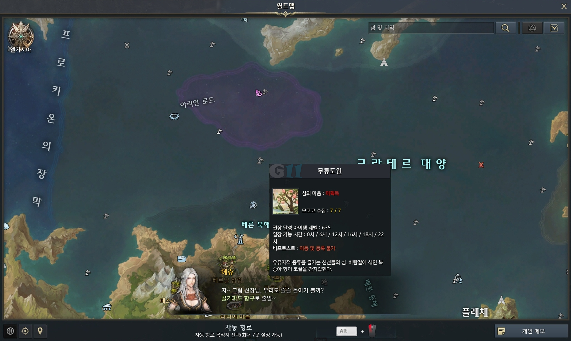 기억의 구슬16 시작 위치는 대항해 무릉도원 섬에서 진행이 가능합니다. 진행을 하기 위해서는 춘연도화주를 마신 상태에서 가능하니 아래 제작 방법을 참고해 제작 후 무릉도원 중앙 골뱅이(@) 지역 끝으로 이동하세요.