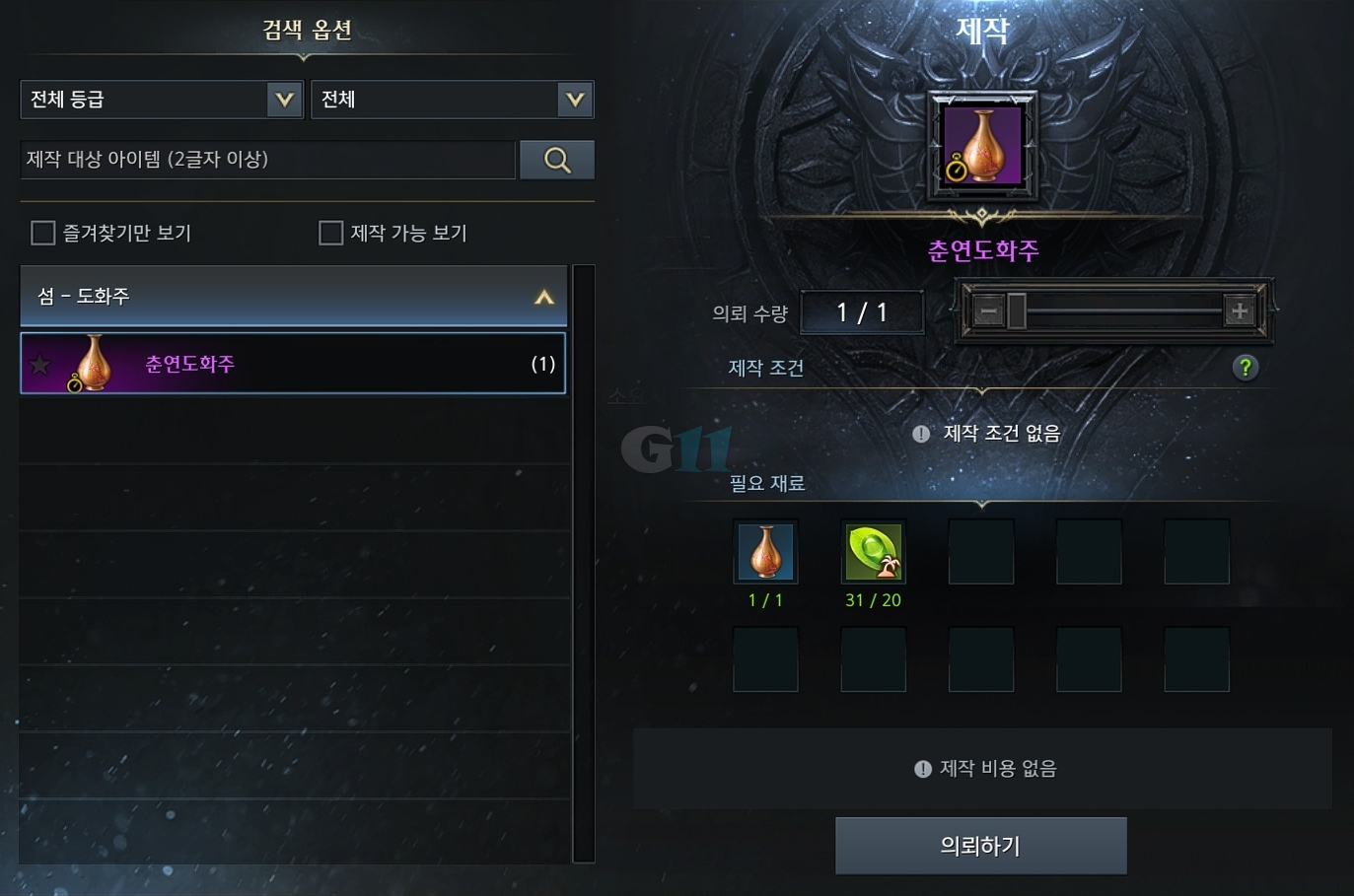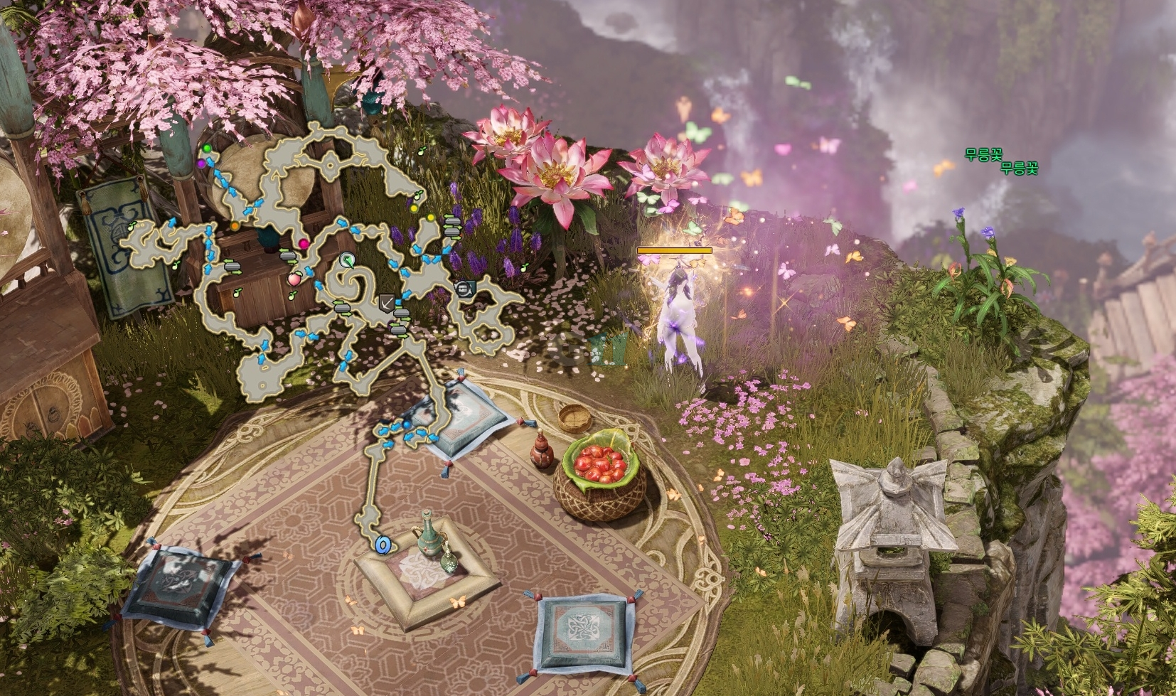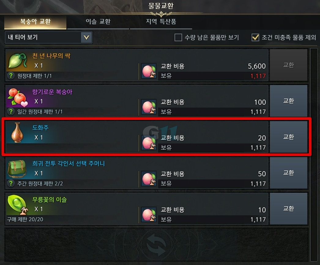 도화주는 3시 방향에 있는 천 년 묵은 항아리를 통해 탱글탱글한 복숭아 20개로 교환이 가능하고 무릉꽃의 이슬은 개당 10개로 교환이 가능합니다. 바로 옆 도화주 제작 비선 NPC를 통해 춘연도화주를 제작할 수 있습니다.