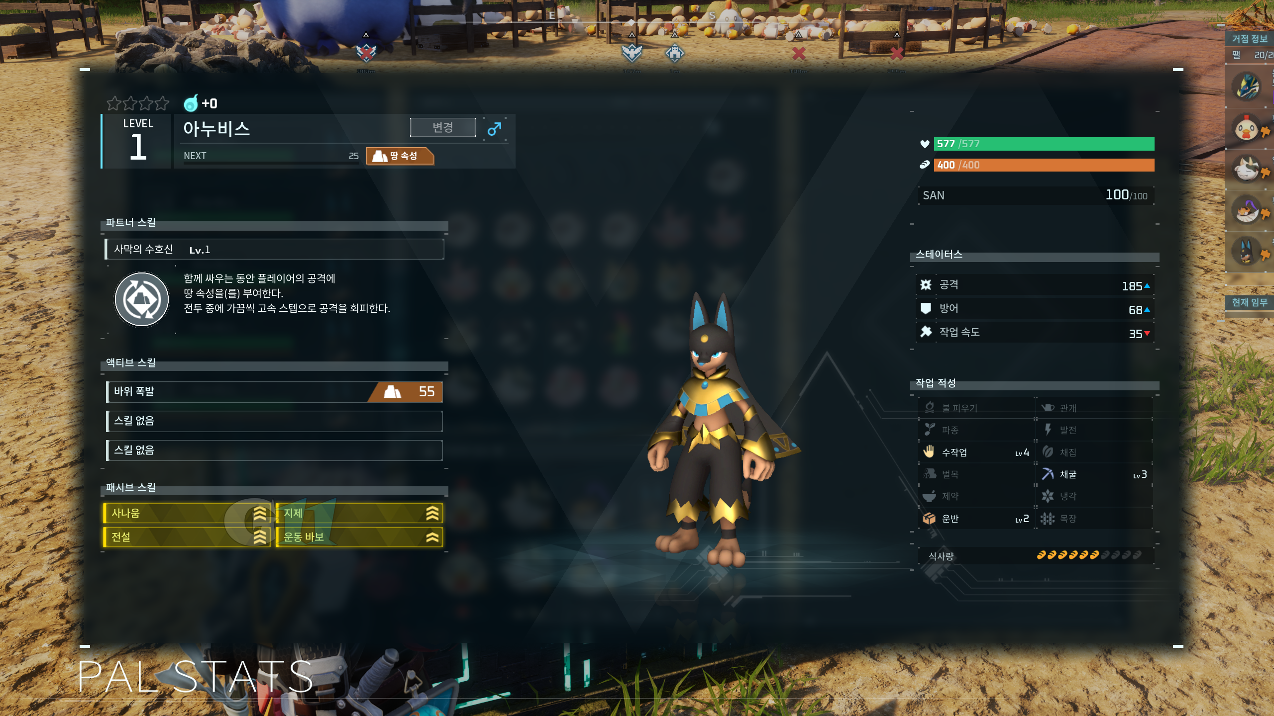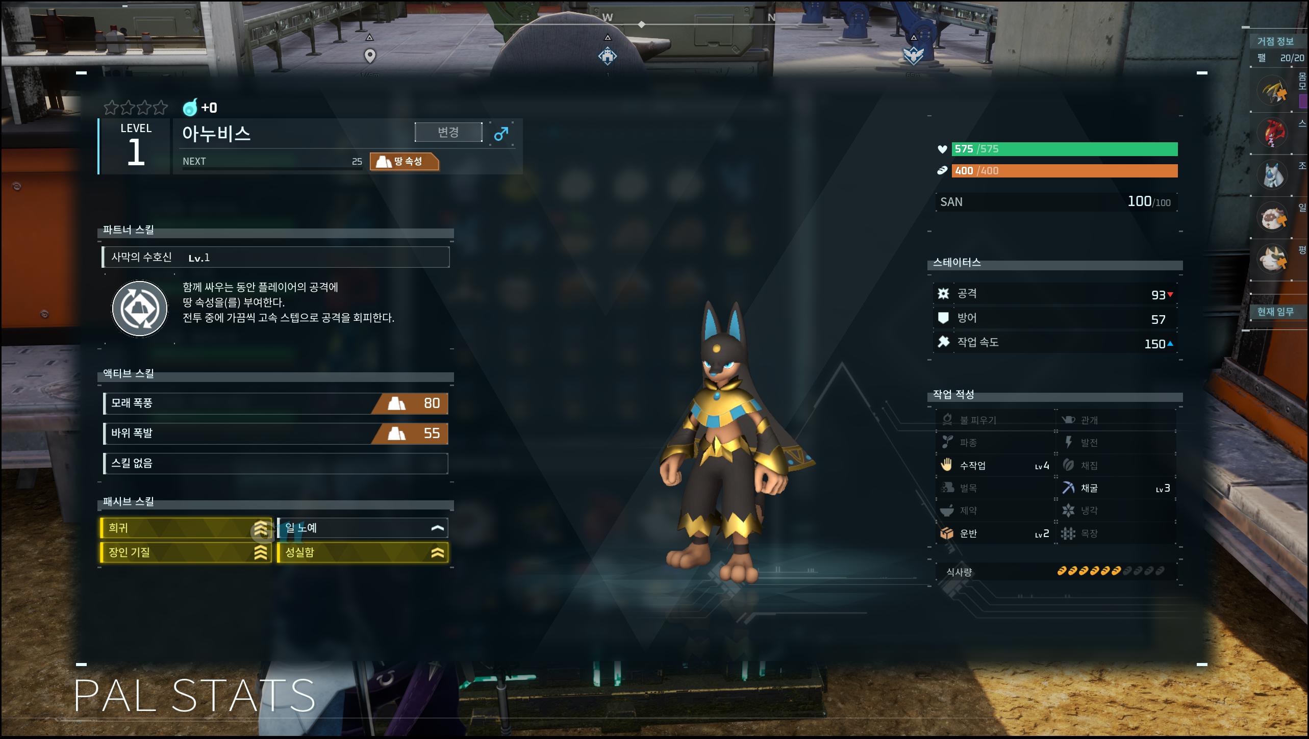거점 팰은 초반용과 후반용 두 구간으로 나누어 팰 티어를 분류했습니다. 거점 팰의 패시브 스킬은 장인 기질, 성실함, 희귀, 일노예로 세팅해 종결하면 됩니다. 패시브 스킬 세팅은 위 글을 참고하세요.