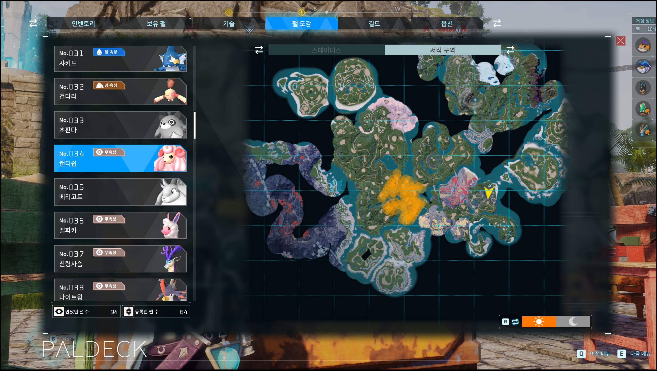 가장 쉽게 파밍할 수 있는 팰은 No.034 캔디쉽으로 계곡 입구나 검호의 구역으로 이동해 캔디쉽 젠 위치로 쉽게 이동할 수 있습니다.