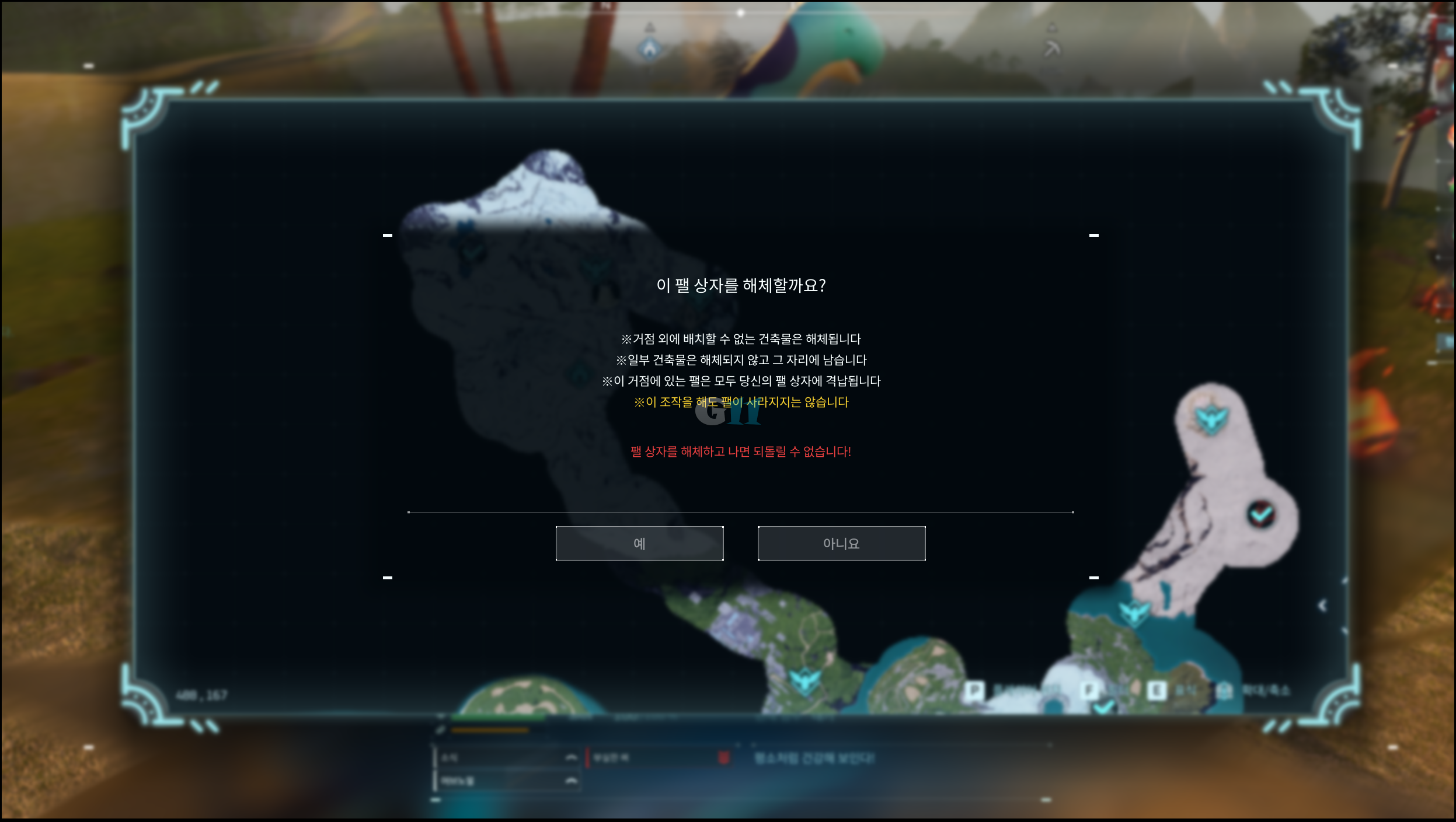 이후 지도[M]를 눌러 파밍에 이용한 거점을 V를 눌러 파괴하고 해당 위치를 마크[E]로 표시해두면 됩니다. 거점을 파괴할 때에는 한번 더 확인하고 신중하게 파괴하세요.