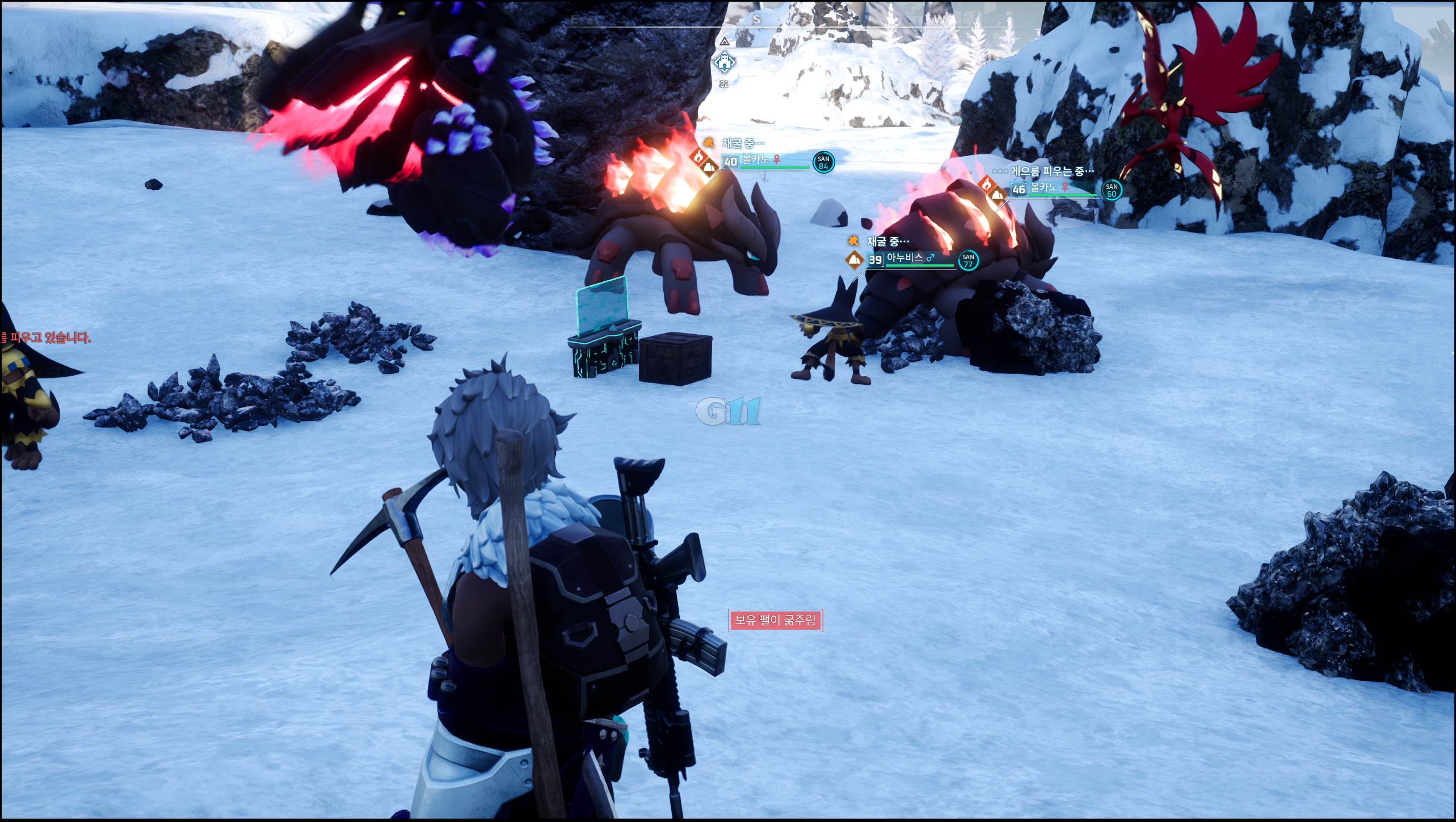 출발하기 전 팰 상자와 상자를 제작할 때 필요한 자원 팰지움 파편 1개, 목재 23개, 돌 8개를 들고 출발합니다. 저는 석영을 캐기 위해 설산 구역으로 왔습니다. 팰 상자와 상자를 최대한 붙혀 설치하면 마우스만 돌려도 상호작용이 가능합니다. 팰 상자를 설치할 때는 수작업이 있는 팰을 소환하세요.