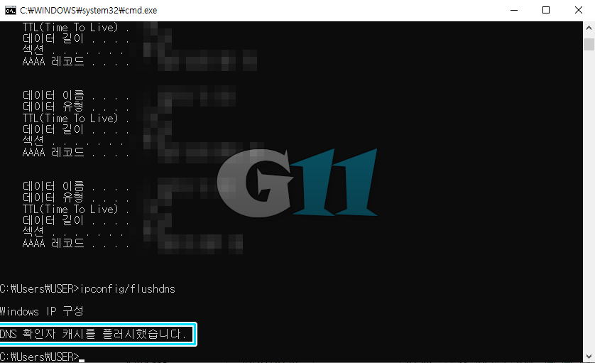 ▲ 위와 같이 데이터 이름과 유형 목록이 쭉 뜨게 됩니다. 이러한 것들은 인터넷 속도를 저하시키는 데이터들로 또 다른 명령어로 이 데이터들을 지워줘야 합니다. 위와 똑같이 이번에는 'ipconfig/flushdns'를 입력하고 엔터를 눌러주세요.