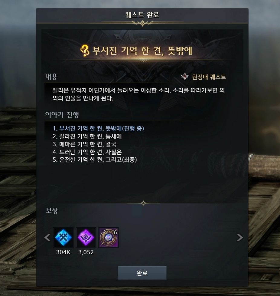 '메마른 기억 한 켠, 결국' 퀘스트를 완료하면 그 자리에서 바로 이어 퀘스트를 진행할 수 있습니다. 이번에도 동일한 방법으로 스토리가 진행됩니다.