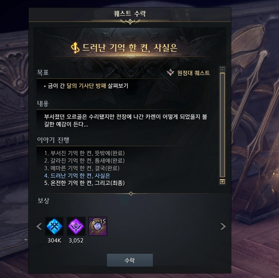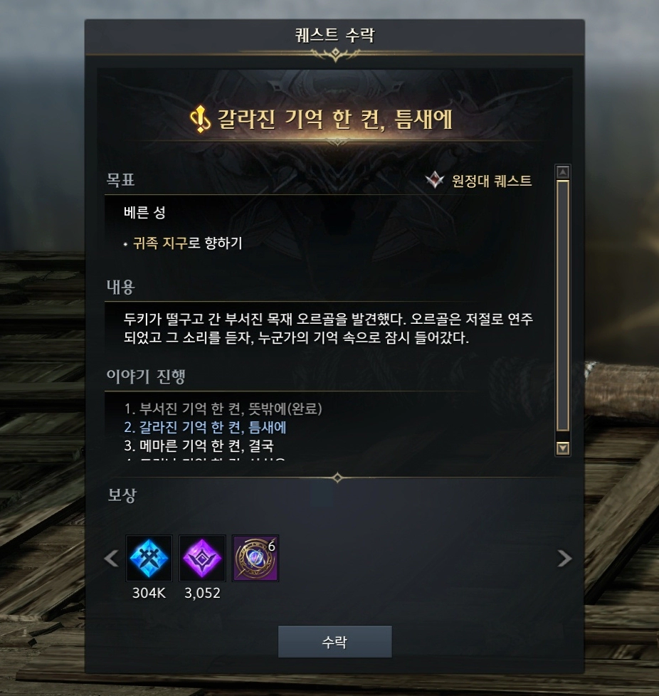 '갈라진 기억 한 켠, 결국' 퀘스트를 완료하면 그 자리에서 바로 이어 퀘스트를 진행할 수 있습니다. 이번에도 동일한 방법으로 스토리가 진행됩니다.