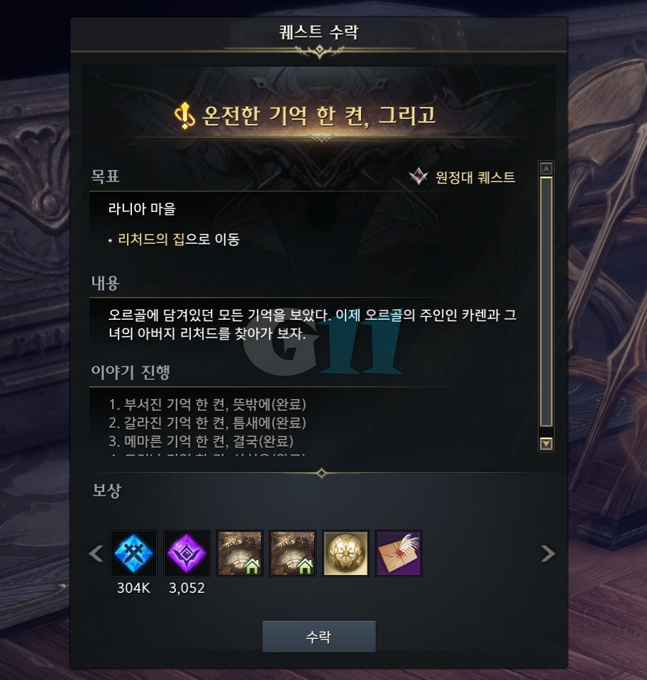 '드러난 기억 한 켠, 사실은' 퀘스트를 완료하면 그 자리에서 바로 이어 퀘스트를 진행할 수 있습니다. 마지막 퀘스트 진행을 위해 라니아 마을로 이동합니다. 상호작용을 몇 번 하다 보면 모든 퀘스트가 완료되고 보상으로 기억의 구슬#20을 획득할 수 있습니다. 마지막으로 장난감 기억의 오르골을 사용해 등록하세요.