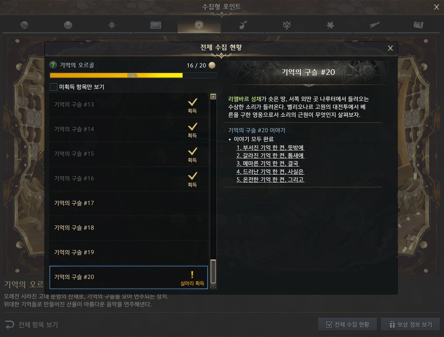 로스트아크 기억의 오르골 기억의 구슬 20 퀘스트 시작 위치를 소개합니다. 수집형 포인트 기억의 오르골 기억의 구슬#20에 대한 자세한 정보는 아래 글을 참고하세요.