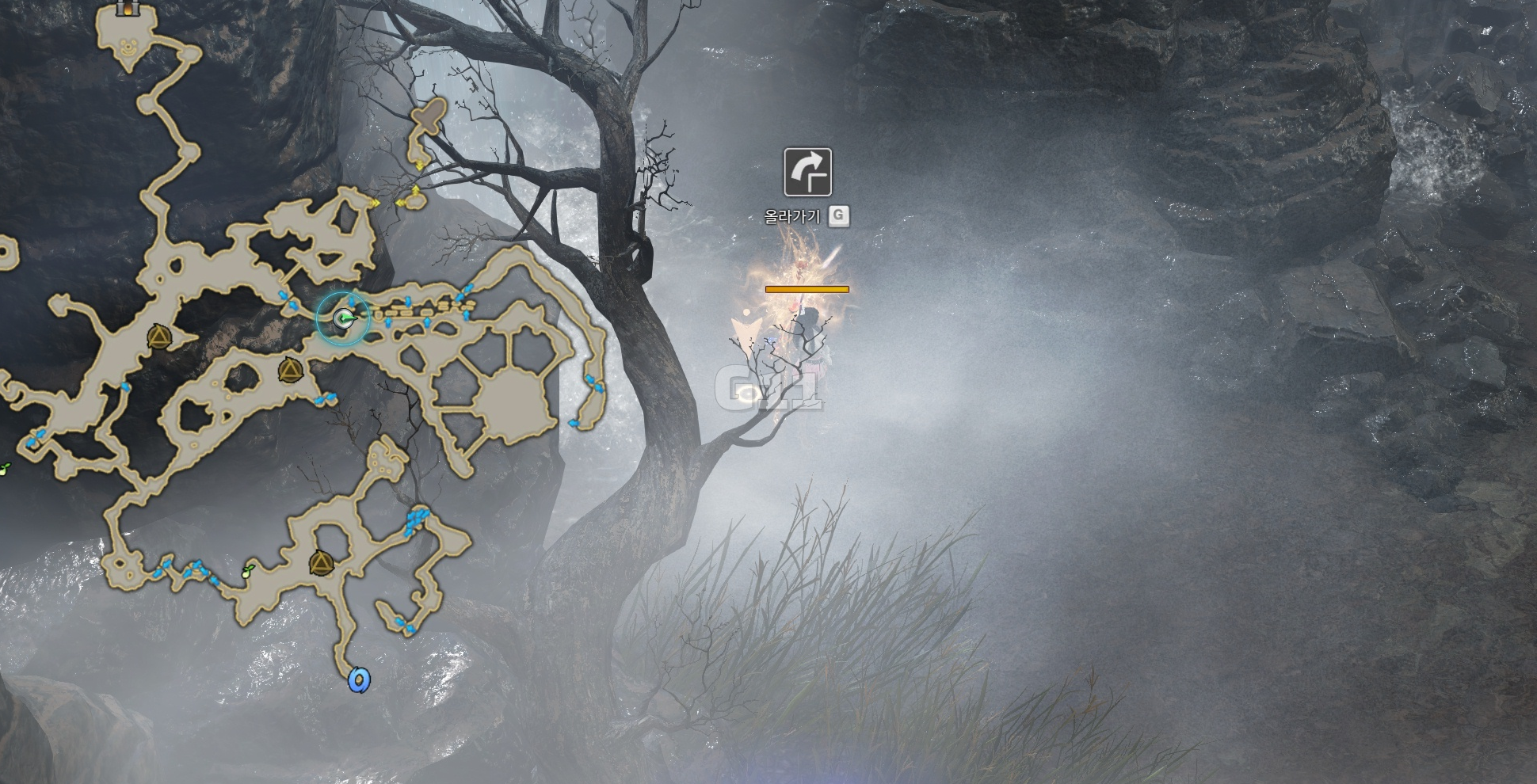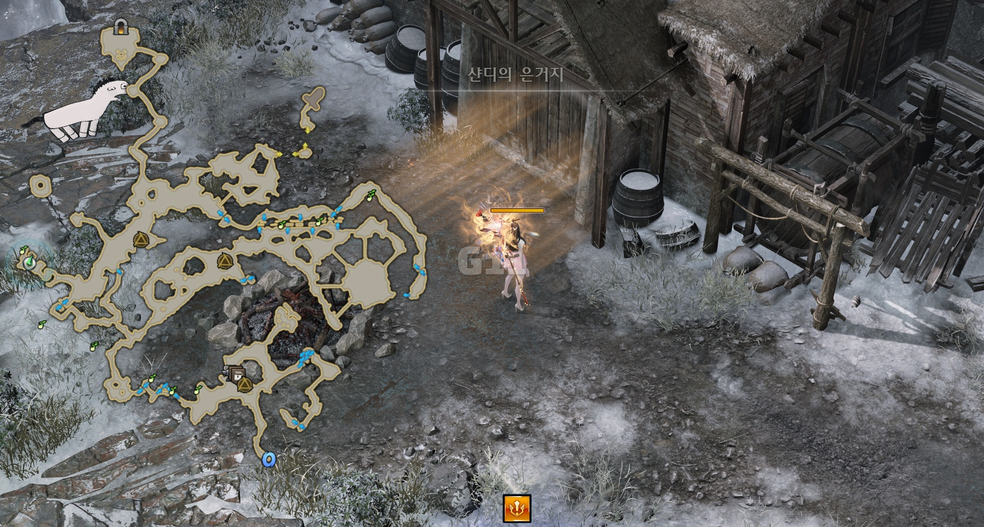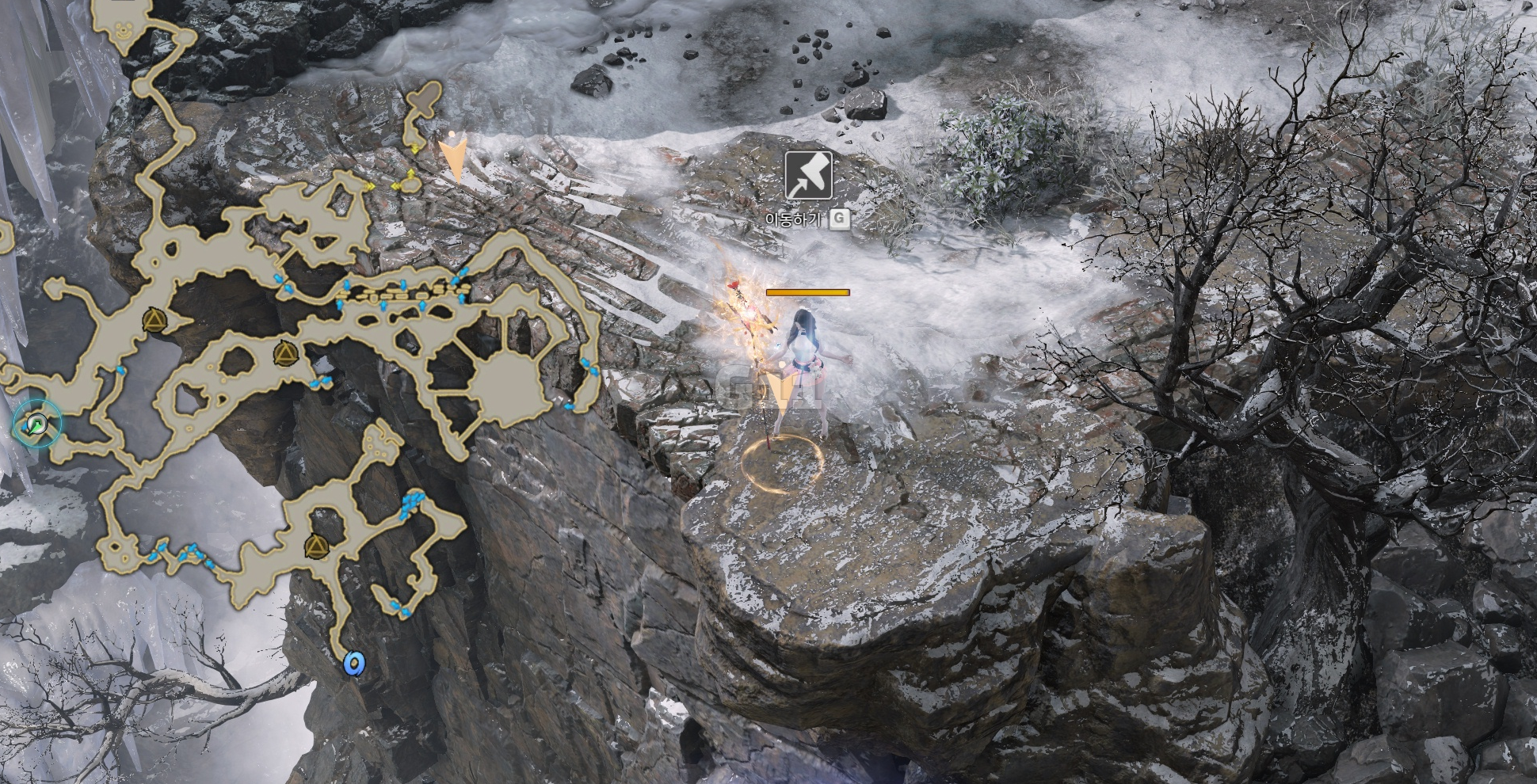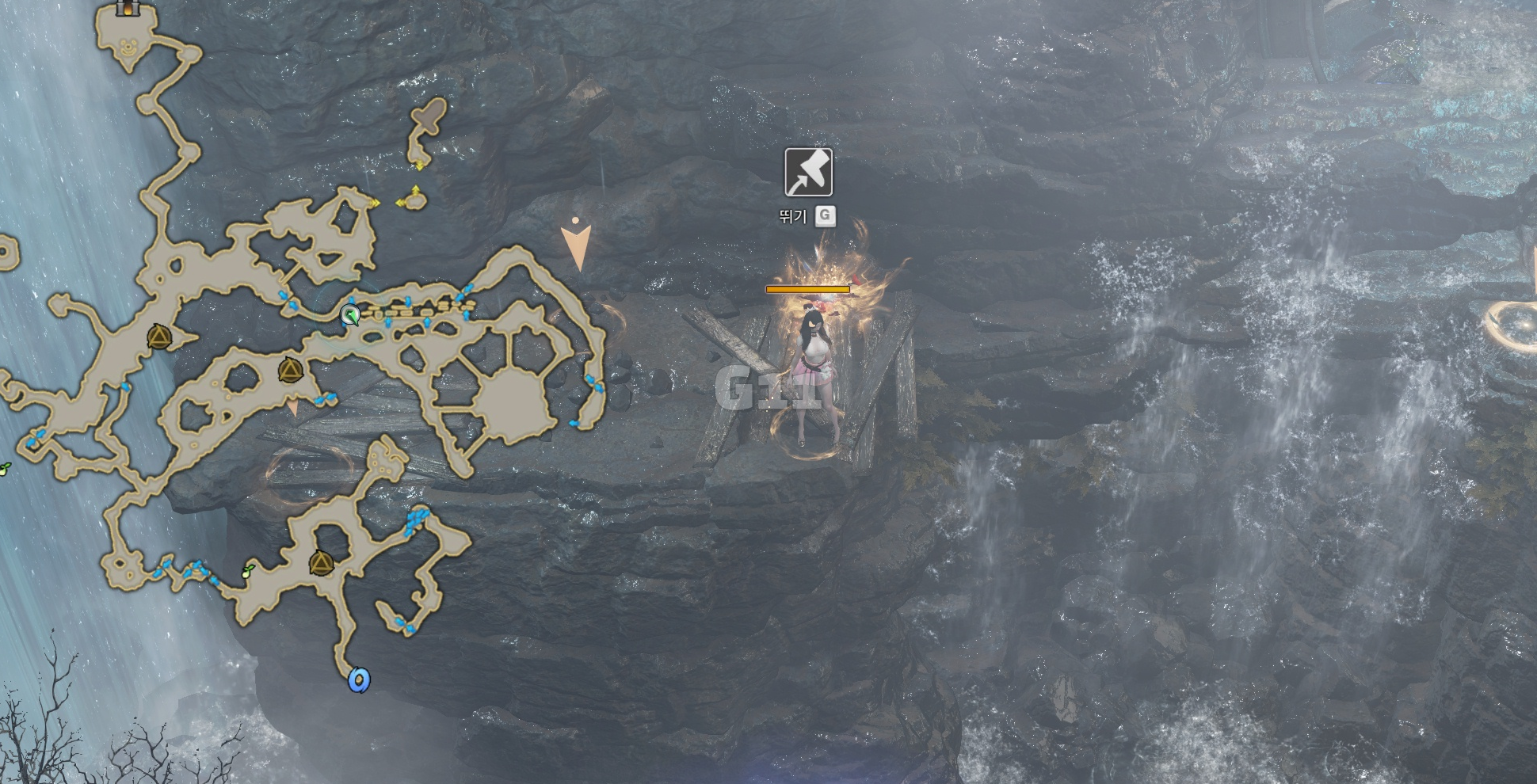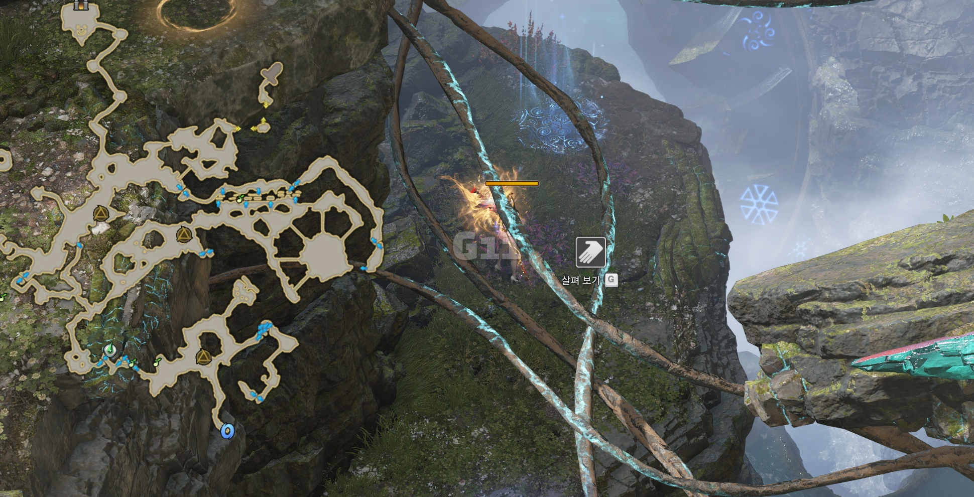 사진의 위치에서 곰을 처치하고 설산 곰의 용기 10 스택을 쌓으면 설산 곰의 도전 버프로 바뀝니다. 설산 곰의 도전 버프 상태에서 큰 곰을 처치하면 도약을 할 수 있는 설산 곰의 포효 버프로 바뀝니다.