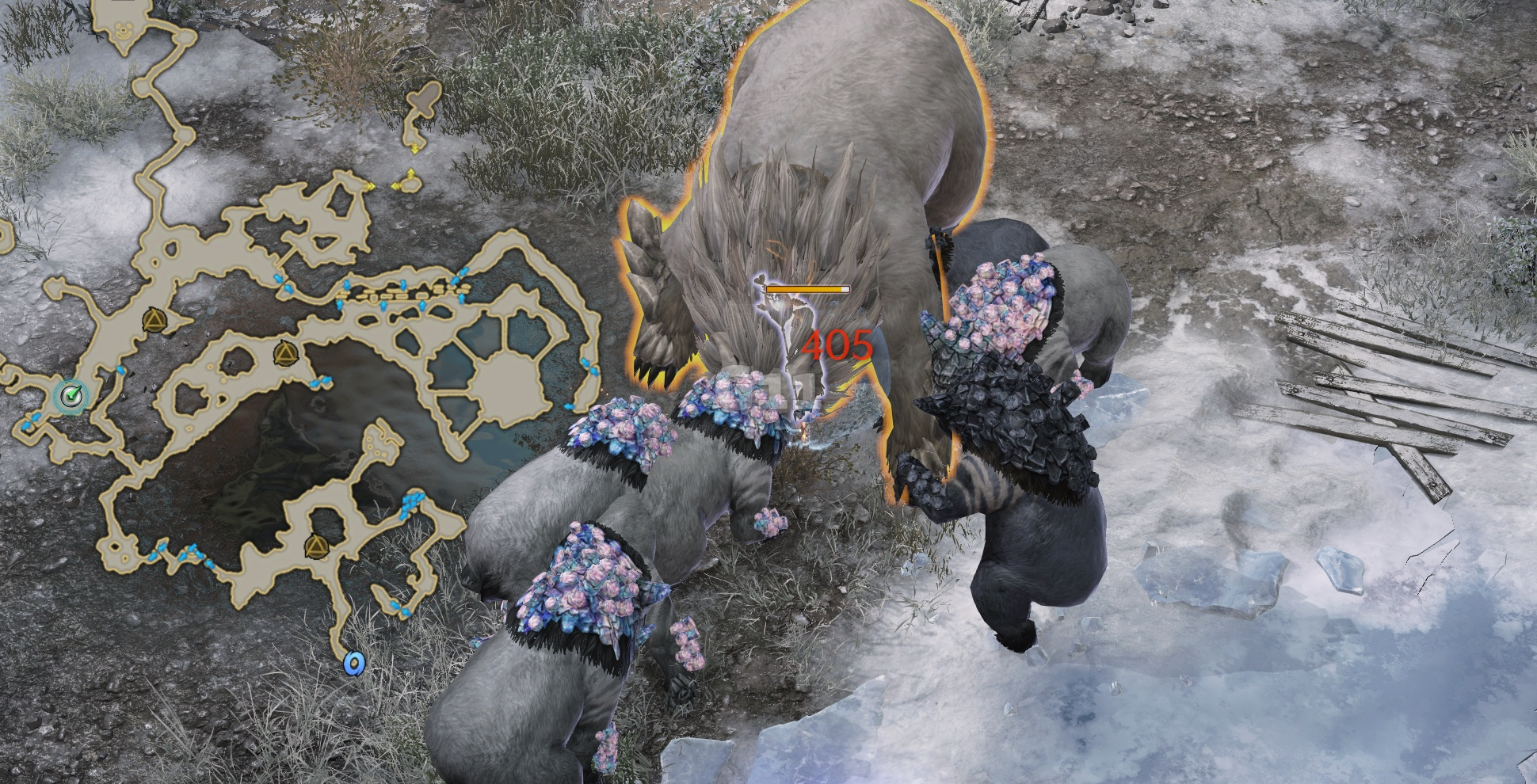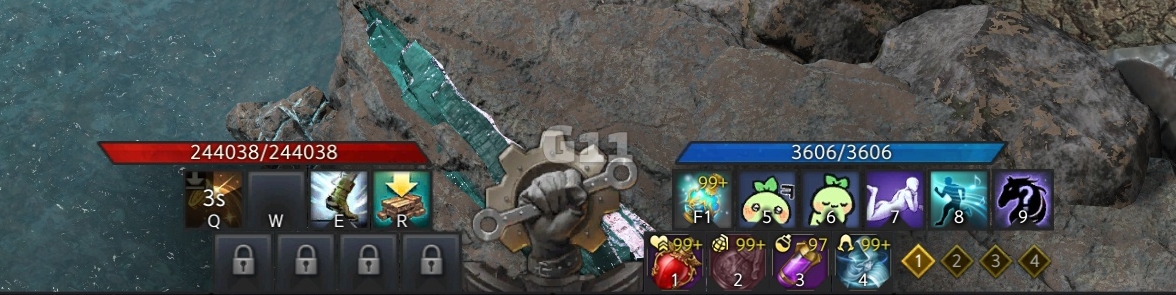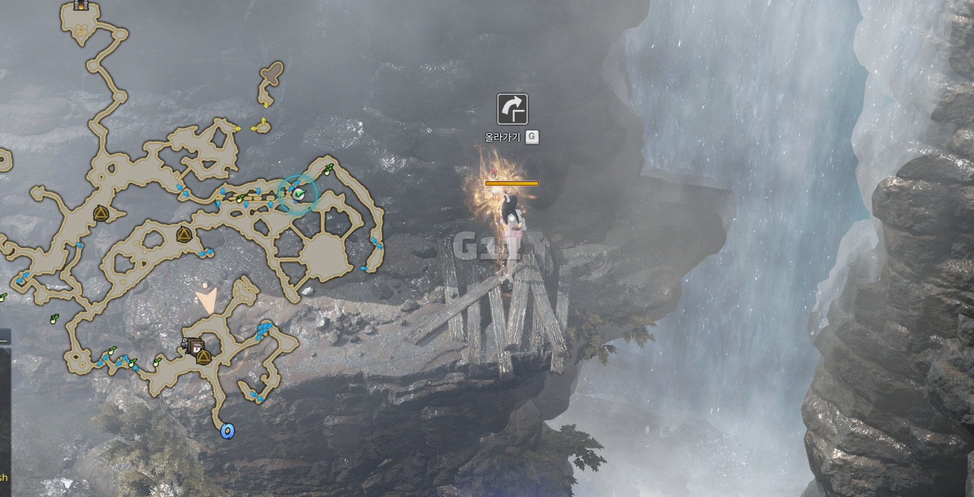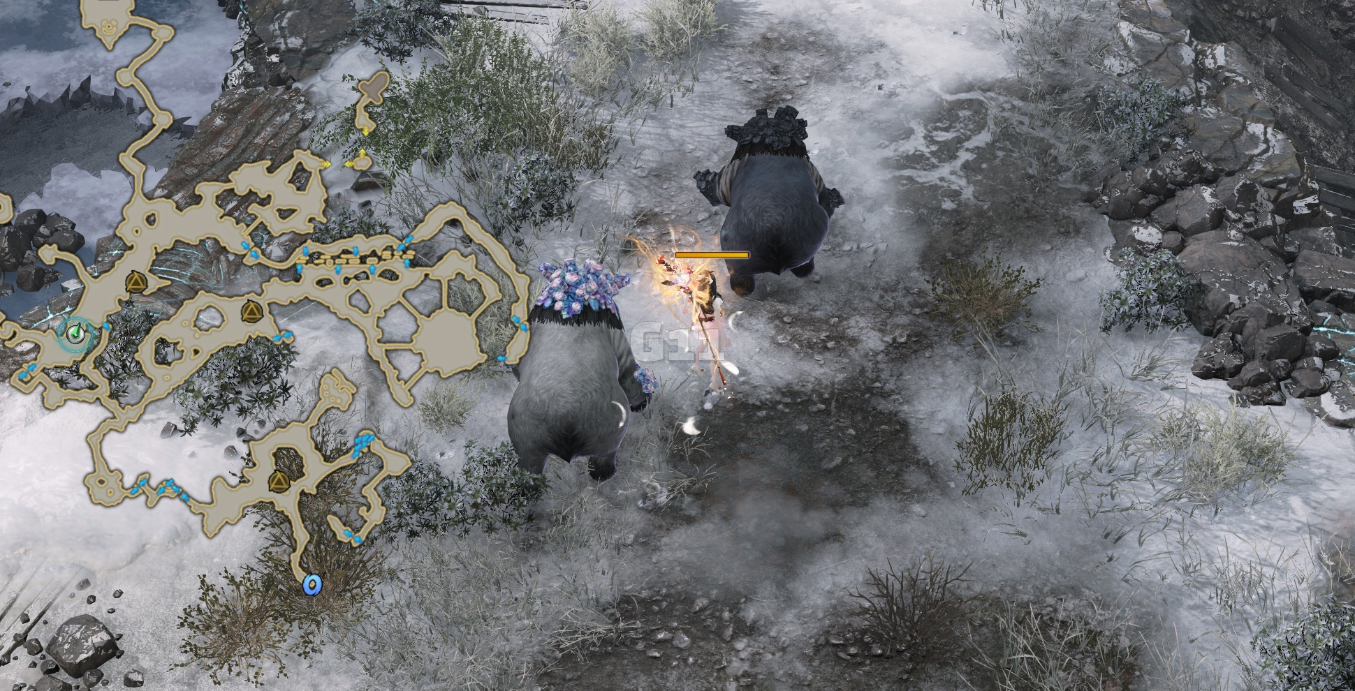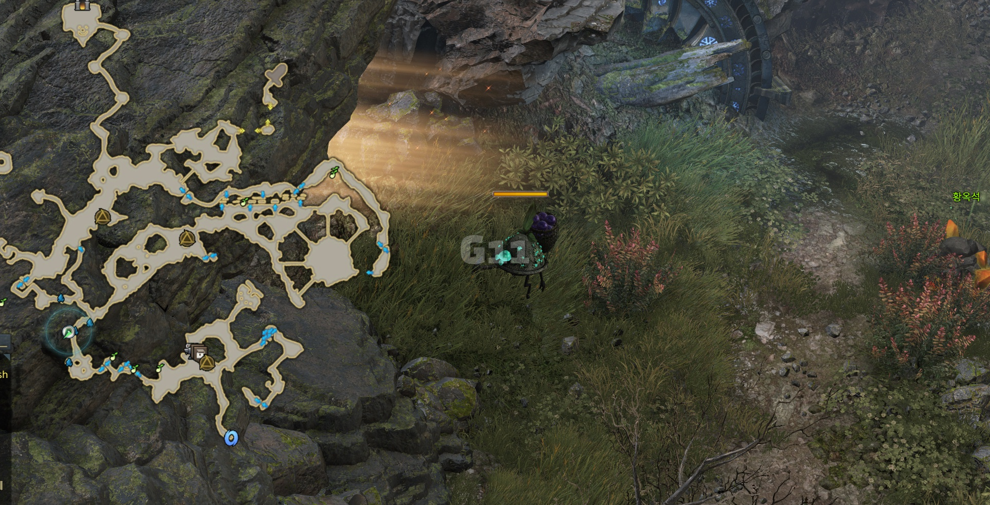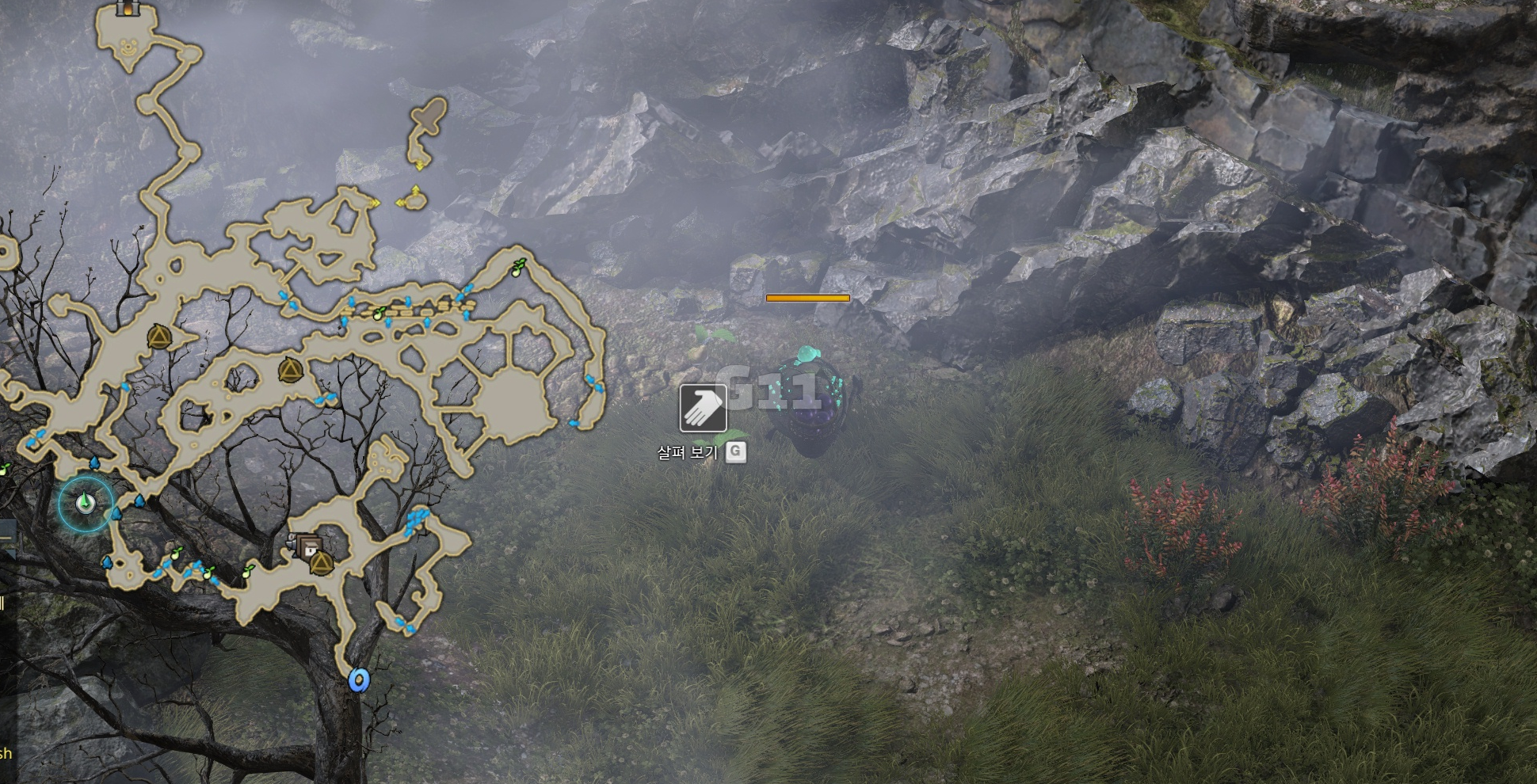 사진의 위치에서 곰을 처치하고 설산 곰의 용기 10 스택을 쌓으면 설산 곰의 도전 버프로 바뀝니다. 설산 곰의 도전 버프 상태에서 큰 곰을 처치하면 도약을 할 수 있는 설산 곰의 포효 버프로 바뀝니다.