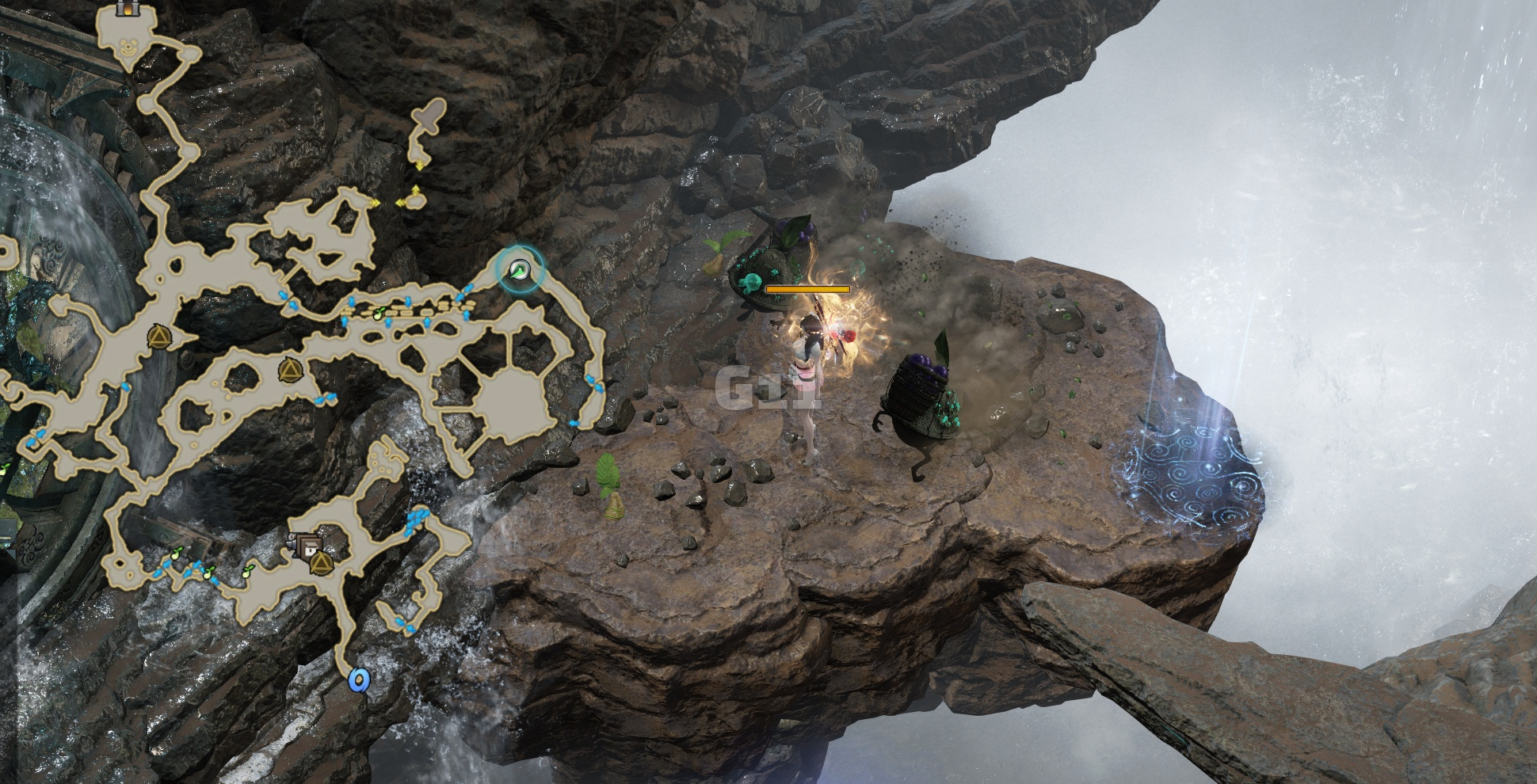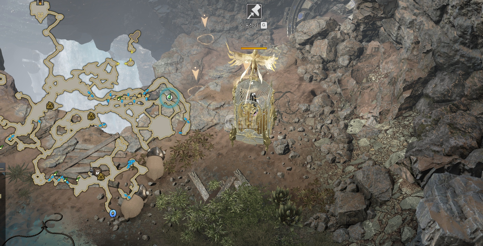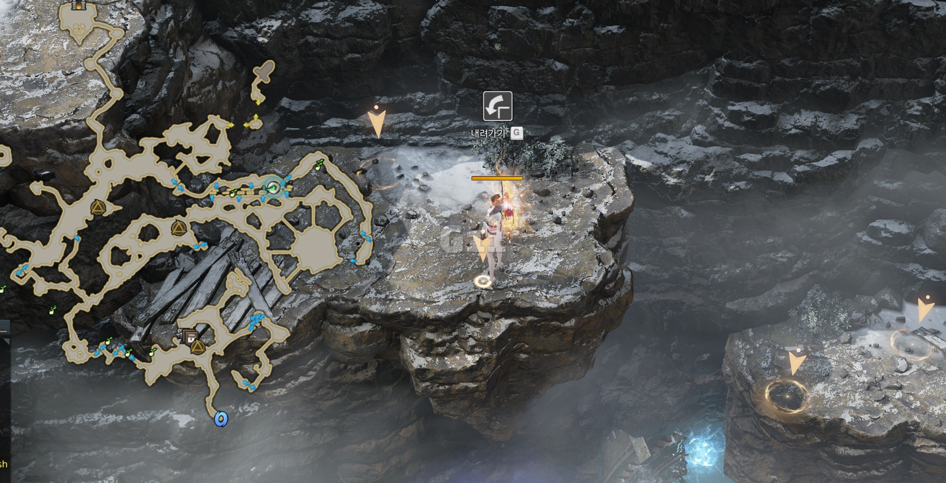 사진의 위치에서 기다리다 보면 포코가 등장하고 내려가기 상호작용이 나타나고 약 1분 동안 내려갈 수 있습니다.