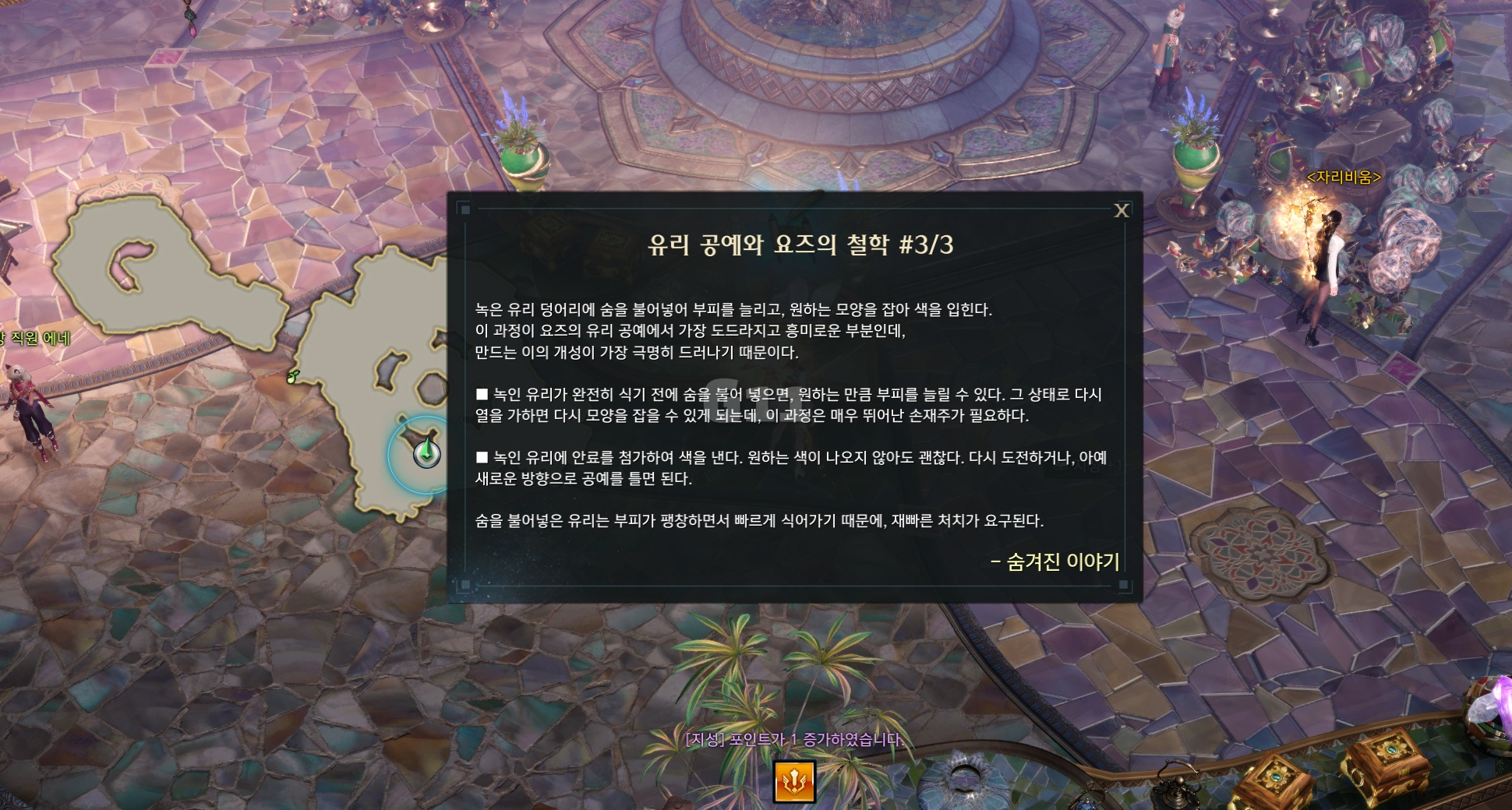 🚨 유리 공예와 요즈의 철학 숨겨진 이야기를 완료하면 보상으로 [지성+1]을 얻을 수 있습니다.
