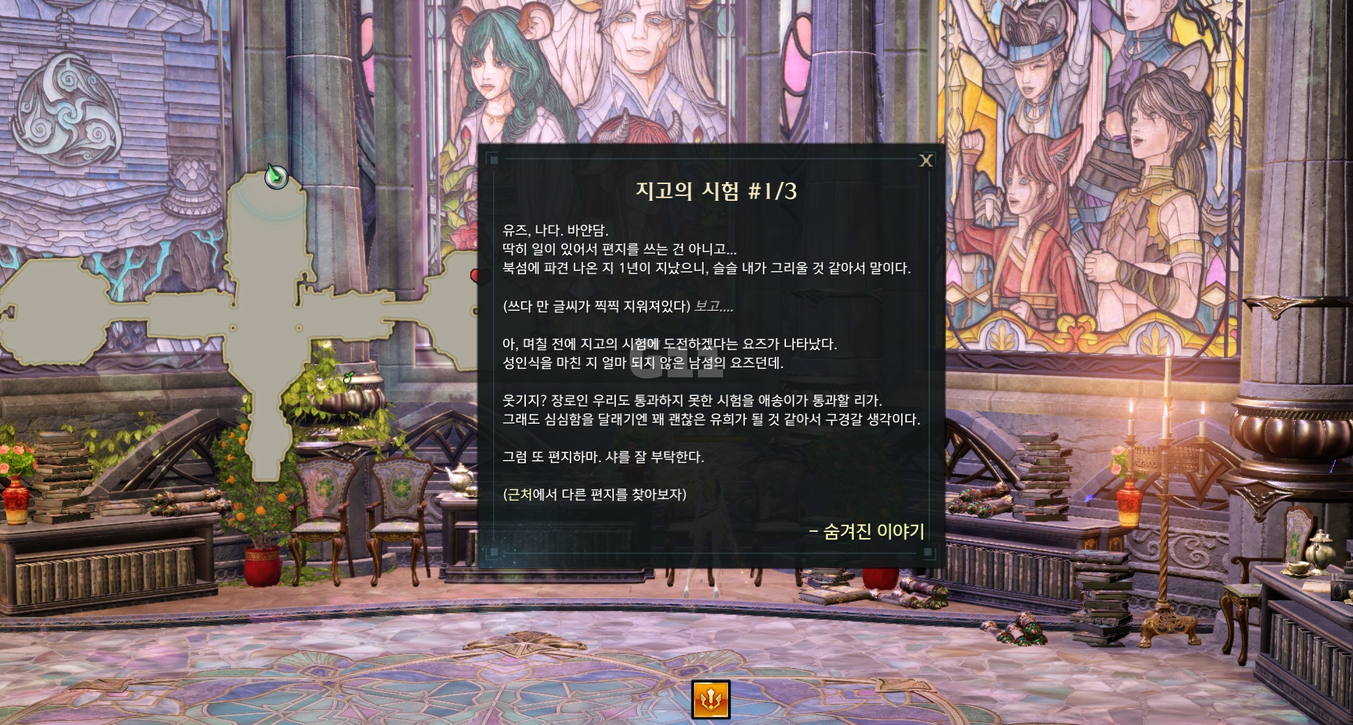 숨겨진 이야기는 아래 순서대로 진행해야 합니다. 순서가 섞일 경우 이야기가 완료되지 않으니 순서에 신경 써서 진행하세요.