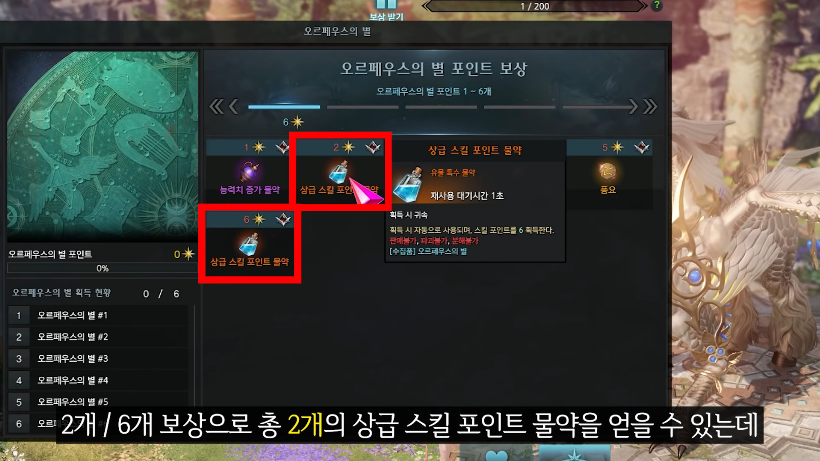 오르페우스의 별 포인트 달성 보상으로 상급 스킬 포인트 물약 2개를 획득할 수 있습니다. 파푸니카 컨텐츠로 얻을 수 있는 오르페우스의 별은 2개, 6개 보상으로 총 개의 상급 스킬 포인트 물약을 획득할 수 있습니다. 비탄의 섬이 추가되면서 6번째 오르페우스의 별을 획득할 수 있으니 아래 링크를 참고하여 구해보세요.