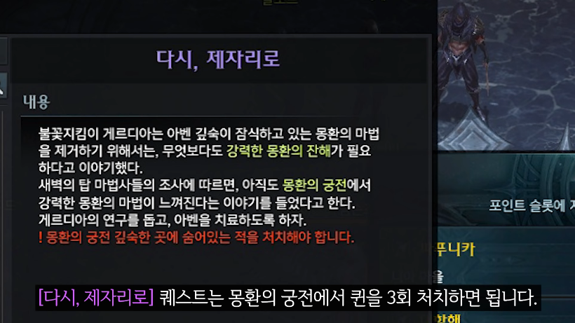 [다시 제자리로] 퀘스트를 완료하면 스킬 포인트 물약을 얻을 수 있습니다. 이 퀘스트를 진행하기 위해서는 선행 퀘스트로 로헨델 에포나 의뢰 [봉인지 복구 작업]을 7회 완료해야 하고 이후 몇 퀘스트를 진행해야하니 자세한 정보는 글 맨 하단에 링크된 유튜버 죠니월드님의 영상을 참고해보세요!