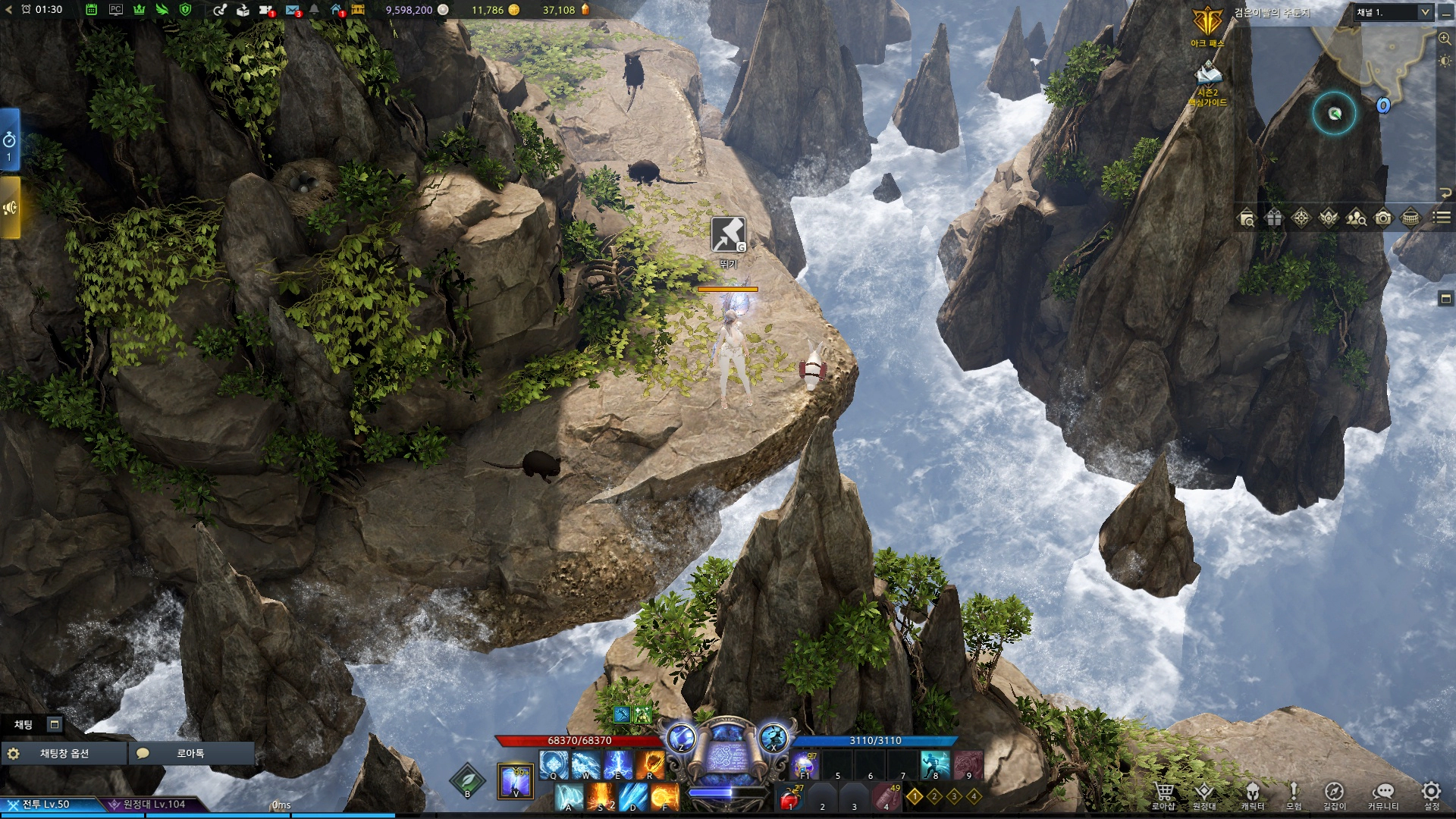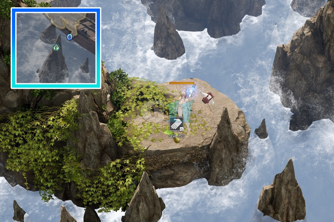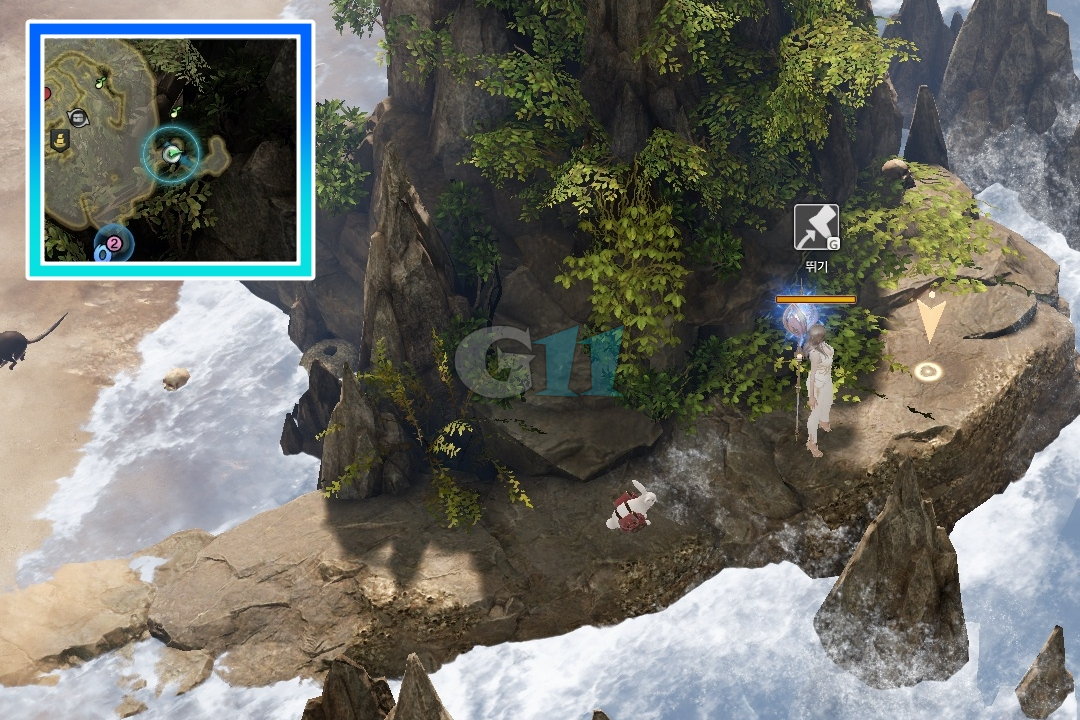 뛰기 표시는 없지만 위와 같이 해당 위치로 이동하면 뛰기 버튼이 활성화됩니다. 뛰기 후 아래로 이동하면 한번 더 점프해 넘어가야 합니다.