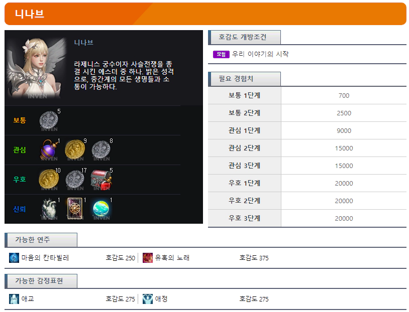 니나브 호감도 등급에 따른 필요 경험치는 위 표를 확인하면 됩니다. 총 필요 경험치 량은 131000으로 높은 편이니 우선순위를 뒤로 미루는 것을 추천합니다. 호감도작에 필요한 악보는 마음의 칸타빌레와 유혹의 노래, 감정표현은 애교와 애정이 필요합니다.