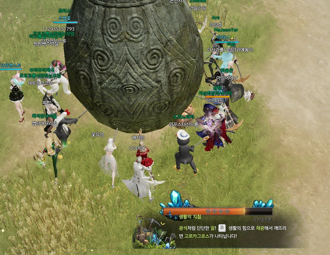 입장 시간에서 3분이 지난 후 맵 중앙에 거대한 알이 생성됩니다. 채광을 통해 알을 파괴할 수 있습니다. 채폭 팟의 경우 채광 폭탄을 사용해 파괴해주면 되고 아닐 경우 입장 전 지역 채팅으로 파티를 구해 진행하는 것을 추천합니다.