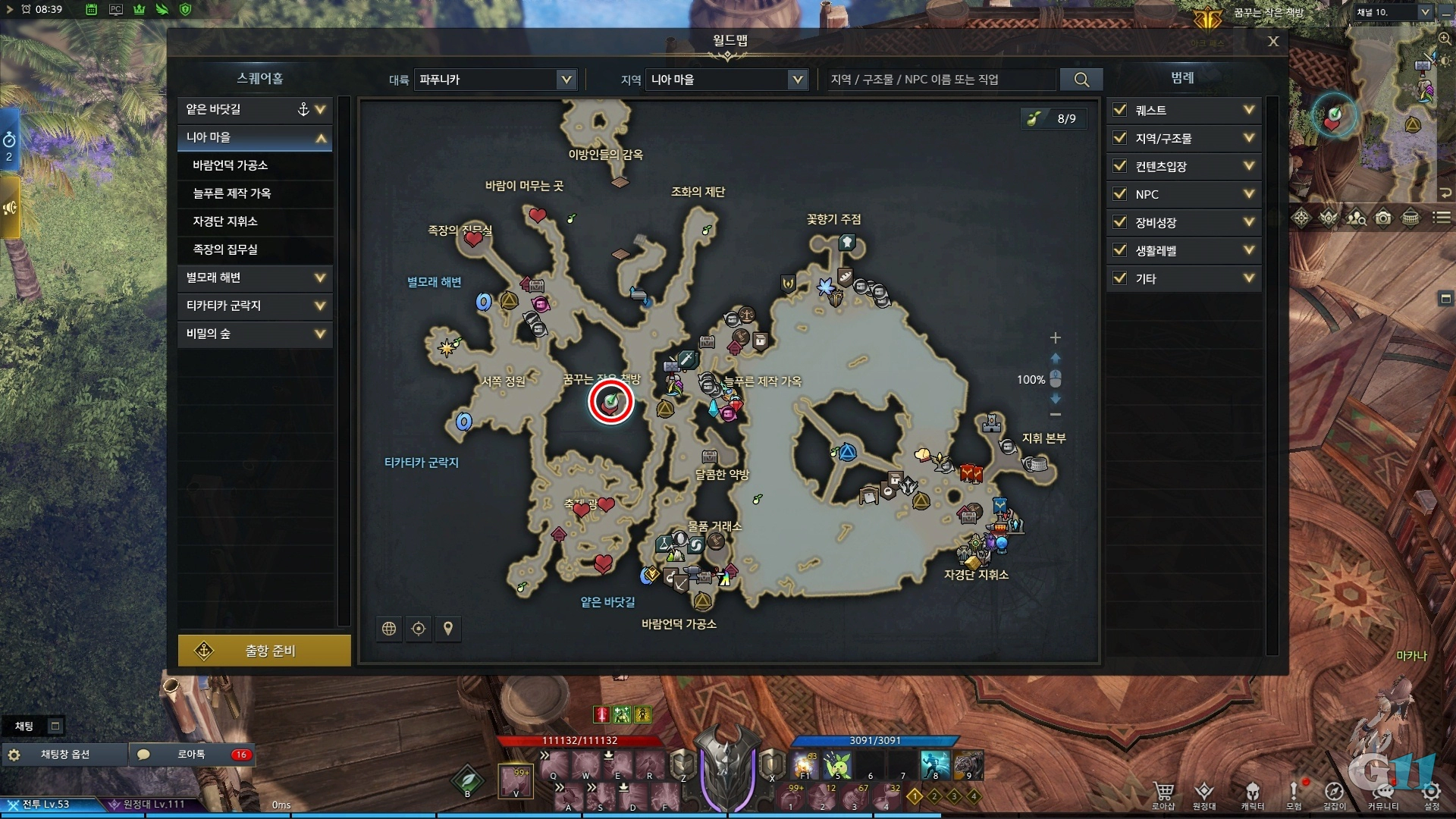 파푸니카 니아 마을의 늘푸른 제작 가옥 스퀘어홀을 타고 달콤한 약방으로 이동합니다.