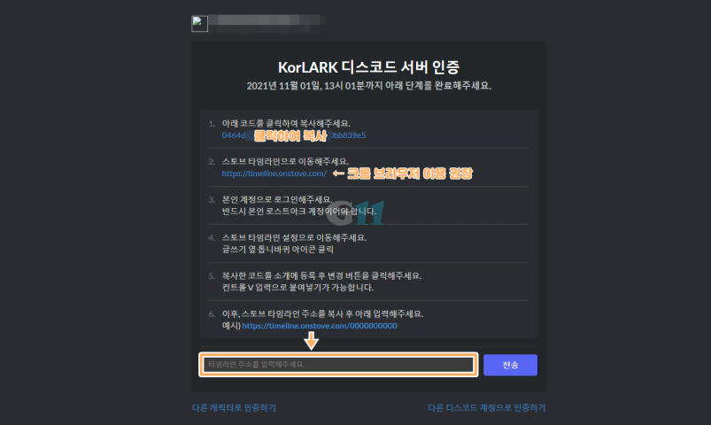 KorLARK 디스코드 서버 인증 창에서 1번 코드 클릭해 복사하고 아래 방법을 따라 하세요.