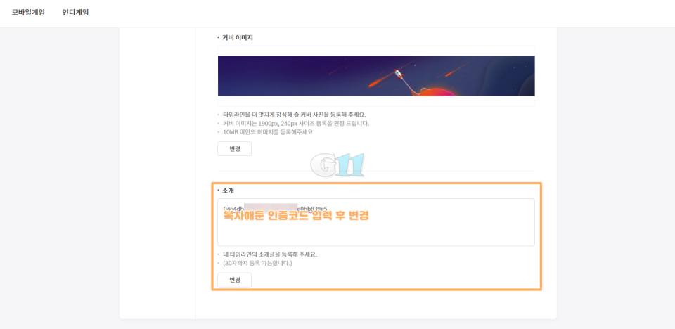 타임라인 설정에서 아래로 스크롤하여 소개 입력란에 KorLARK 디스코드 서버 인증 창에서 복사해둔 코드를 입력하고 변경 버튼을 클릭합니다. 이후 KorLARK 디스코드 서버 인증 창에서 내 [타임라인 URL]을 입력하고 전송하면 인증 작업이 완료됩니다. 인증 후에는 코드를 바꿔도 상관없습니다.