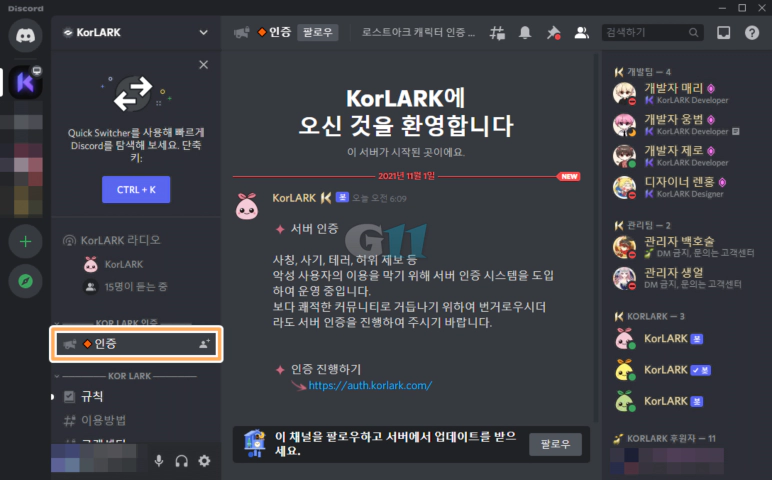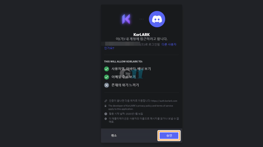 인증을 하기 위해 KorLARK 디스코드 채널과 연동을 승인합니다.