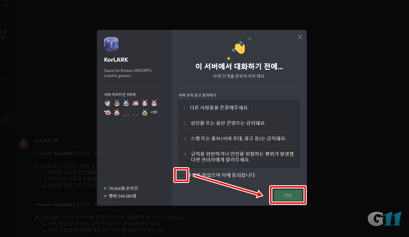 4. 서버 규칙을 확인하고 동의 버튼에 체크 후 [전송]을 클릭합니다.
