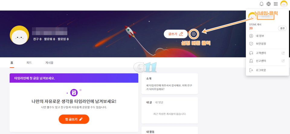 [스토브 타임라인 사이트]로 이동해 로그인하고 상단 프로필 > 닉네임을 클릭하여 내 타임라인으로 이동합니다. 내 타임라인 주소는 KorLARK 디스코드 서버 인증 창에 입력해야 합니다. 이후 설정 버튼을 클릭합니다.