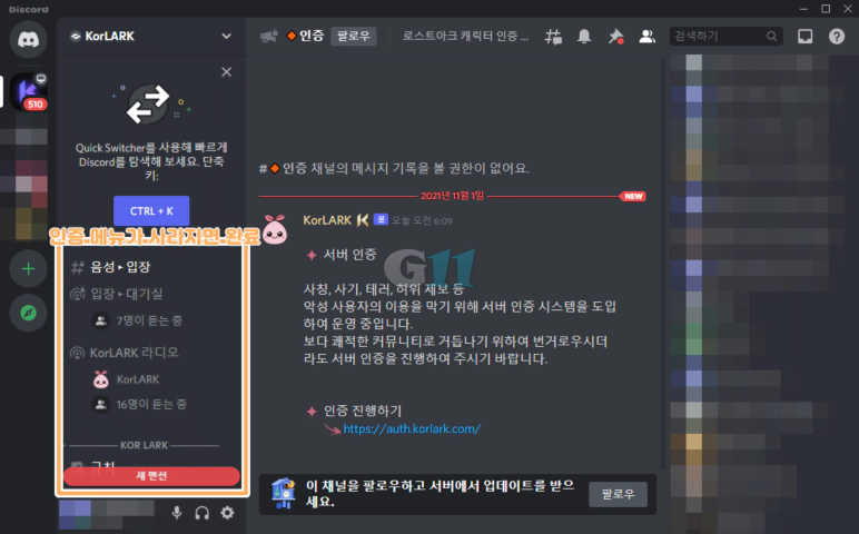 KorLARK 디스코드 인증이 완료되면 위와 같이 메뉴에서 인증 탭이 사라집니다.