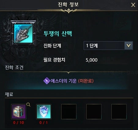 에스더 무기는 아브렐슈드 노말 5-6 관문을 진행할 수 있는 1520 레벨이 돼야 하고, 아브렐슈드 5-6 관문을 클리어하면 얻을 수 있는 에스더 퀘스트 시작 아이템 '에스더:갈라투르의 의지'를 얻어야합니다. 아이템 클릭 시 퀘스트를 진행할 수 있습니다. 이후 욘 대륙 위대한 성 중앙에서 내려갈 수 있는 갈라투르 공방에서 퀘스트를 진행할 수 있습니다. 욘과 로헨델을 다녀오면 퀘스트를 어렵지 않게 완료할 수 있습니다. 처음 얻는 에스더 무기의 능력치는 0단계로 품질은 100으로 고정이며 아이템 레벨의 경우 1100입니다. 이 후 아래 표와 같이 재료를 얻고 진화할 수 있으며 단계별로 능력치는 물론 무기 외형이 변경됩니다.