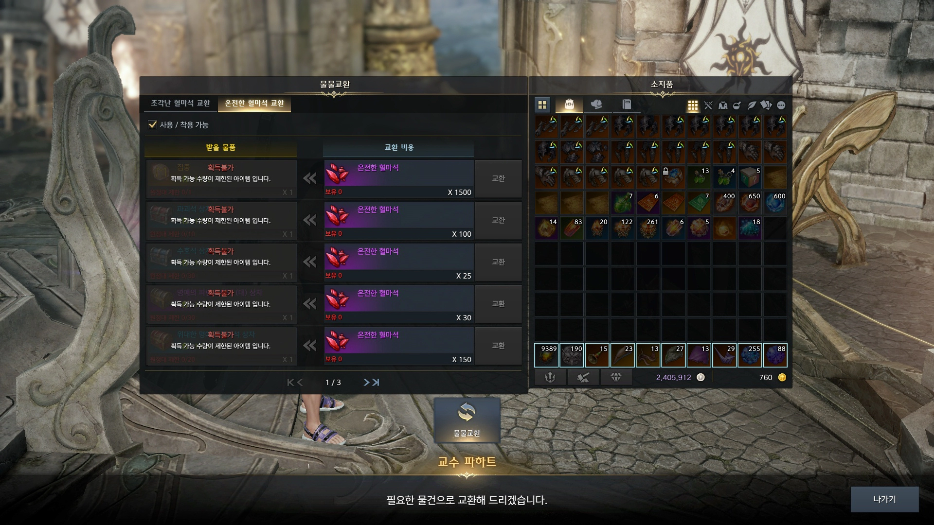 온전한 혈마석은 1415 레벨부터 가능합니다. 교환 가능한 아이템 목록은 아래와 같습니다.