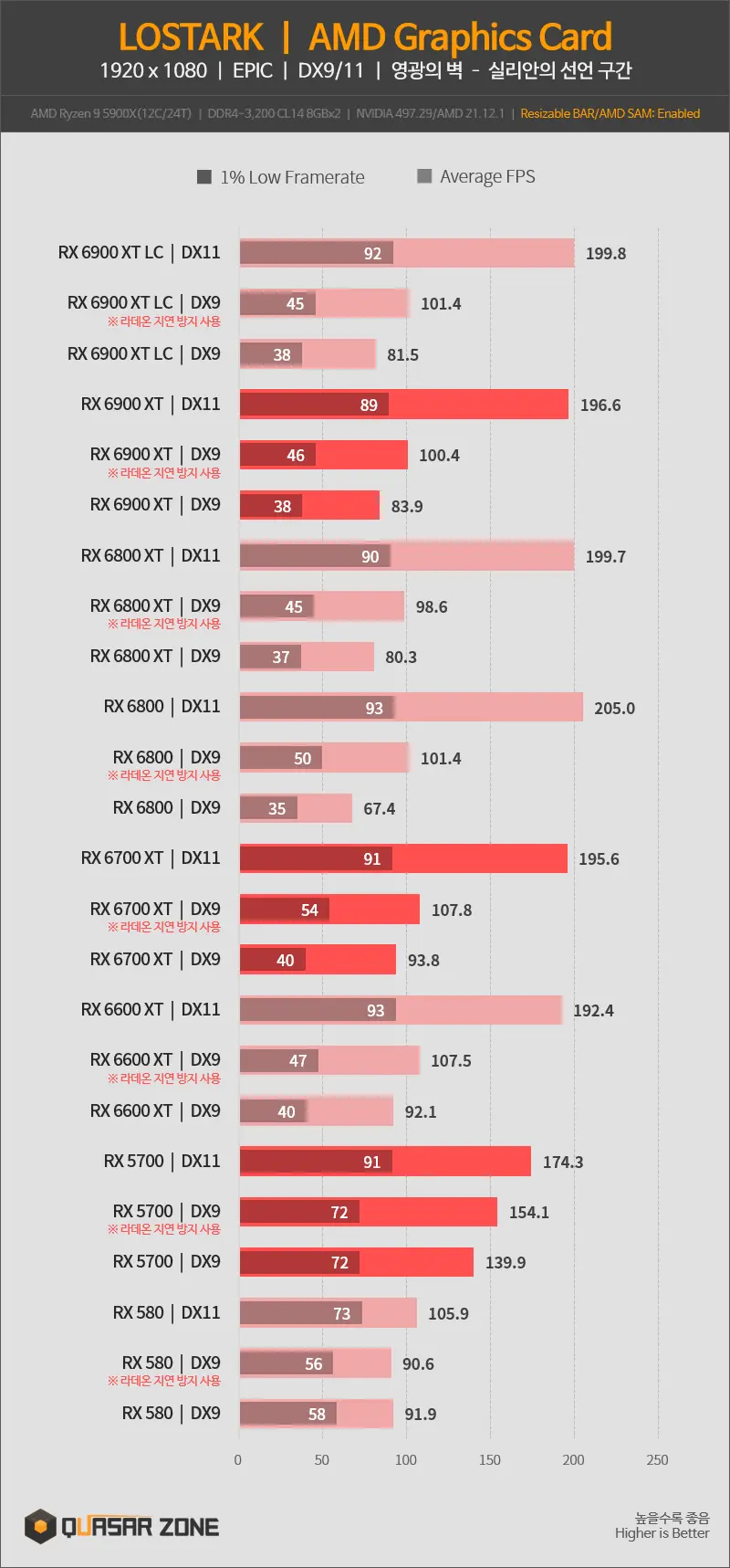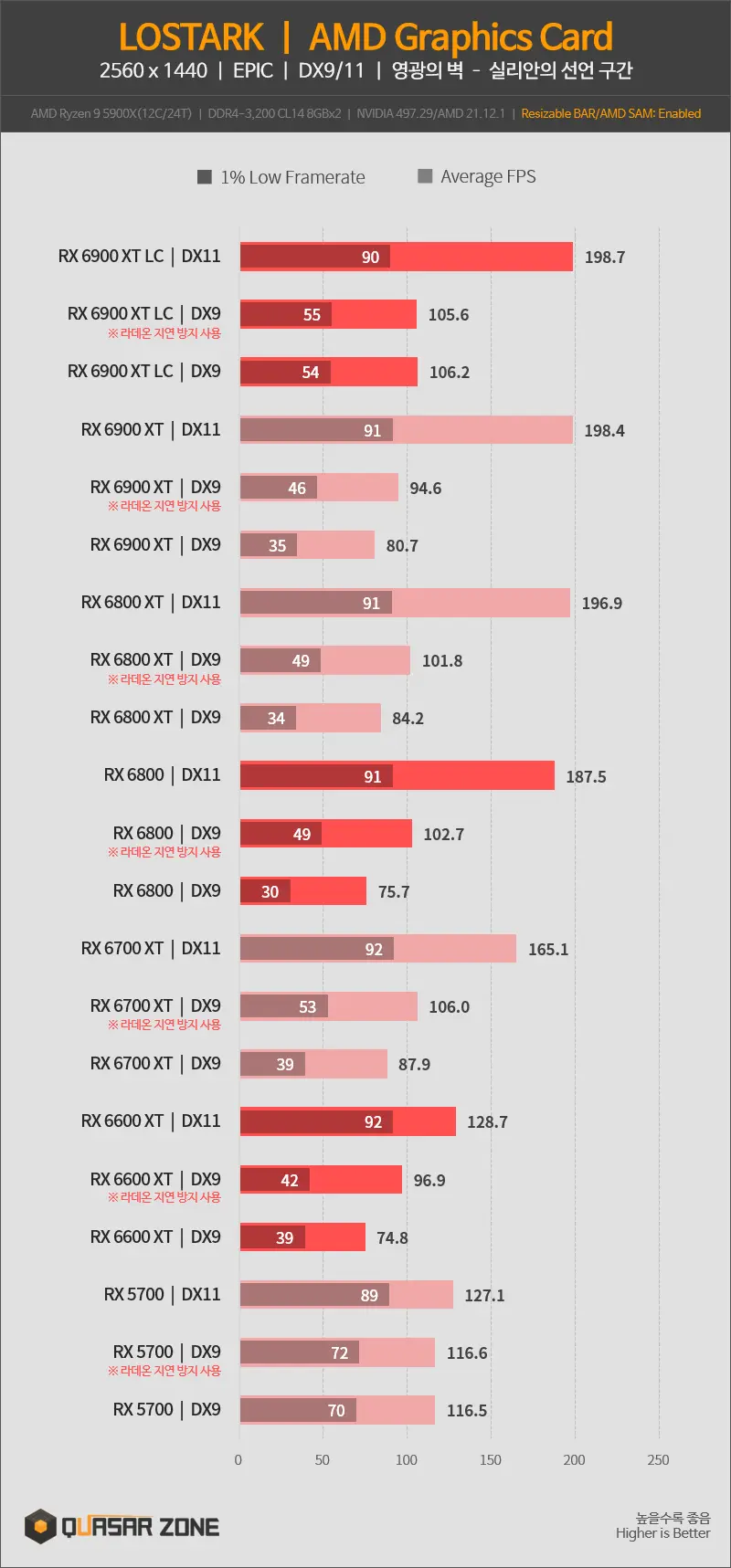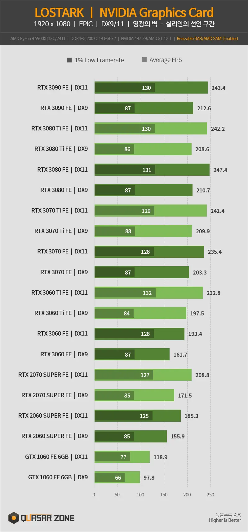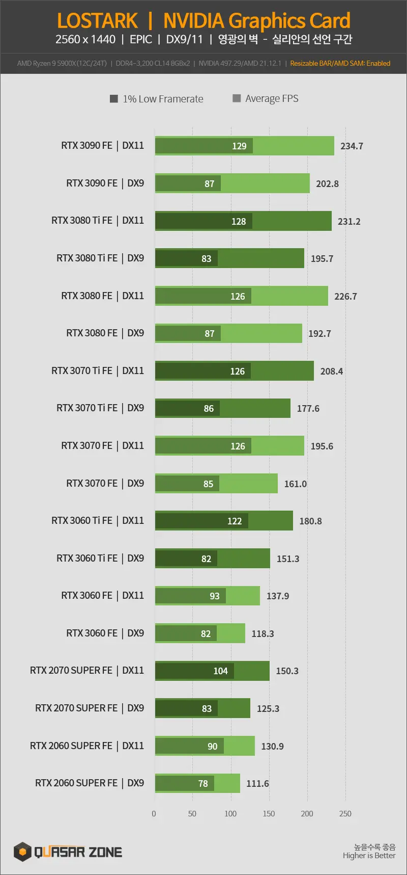 QHD 모니터는 최소 RTX3060 TI 이상 스펙에서 사용을 권장합니다. 60프레임만 나와도 괜찮다면야 상관없지만 RTX3060 이하 등급의 그래픽카드에서는 QHD 모니터 사용 시 프레임 드롭 현상을 체감할 수 있으니 구매 시 참고하세요. WQHD 모니터의 경우 더 심하게 체감됩니다. WQHD 모니터는 최소 3070 이상 스펙에서 사용을 권장합니다. 로스트아크는 최적화가 잘 된 편이라고 느껴지지만 와이드 모니터 선택 시 RTX3070 그래픽카드 정도 사용해야 제 성능을 발휘합니다. 원하는 프레임을 뽑으려면 위 그래픽카드 별 성능 차트를 확인하세요.