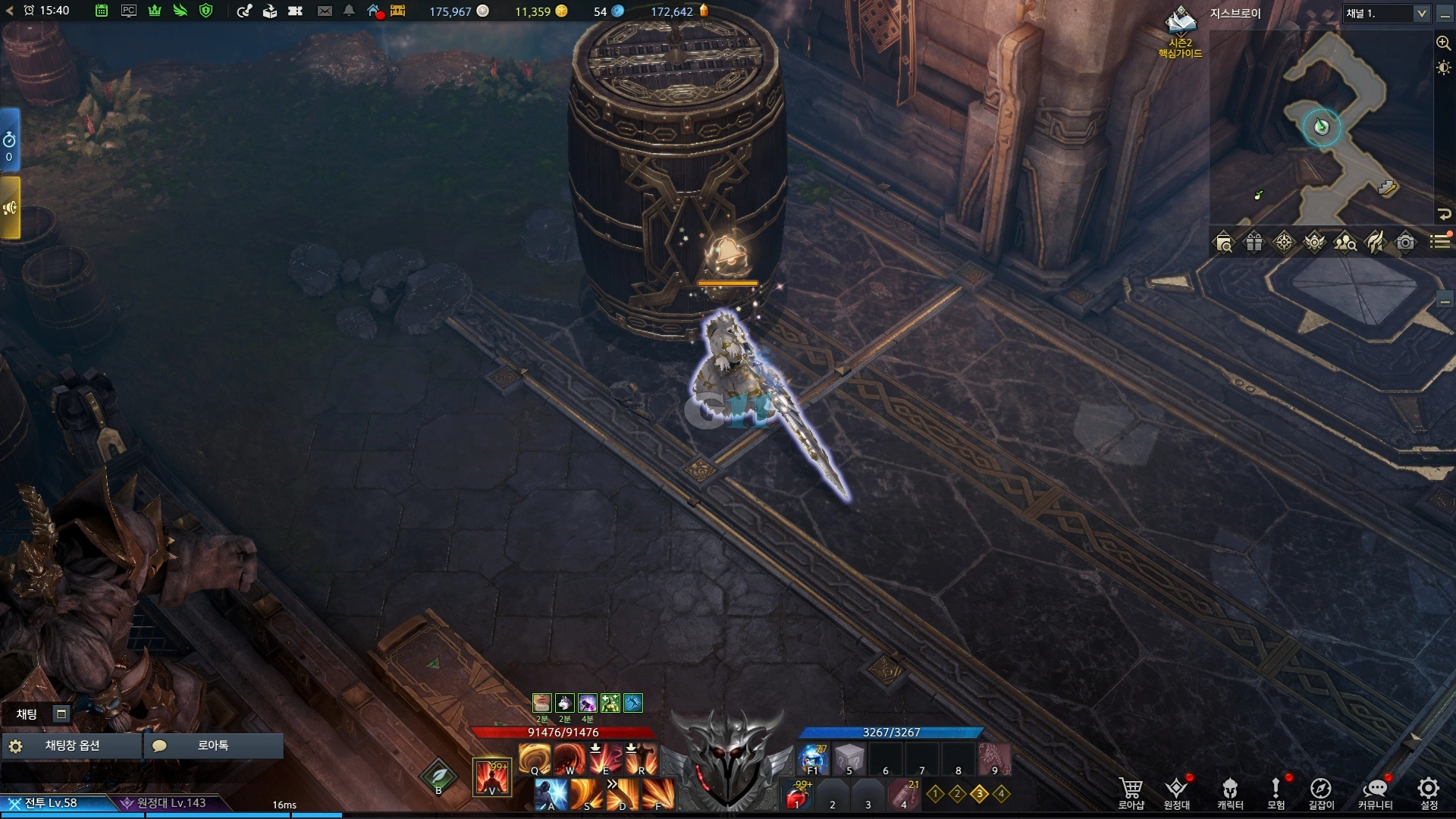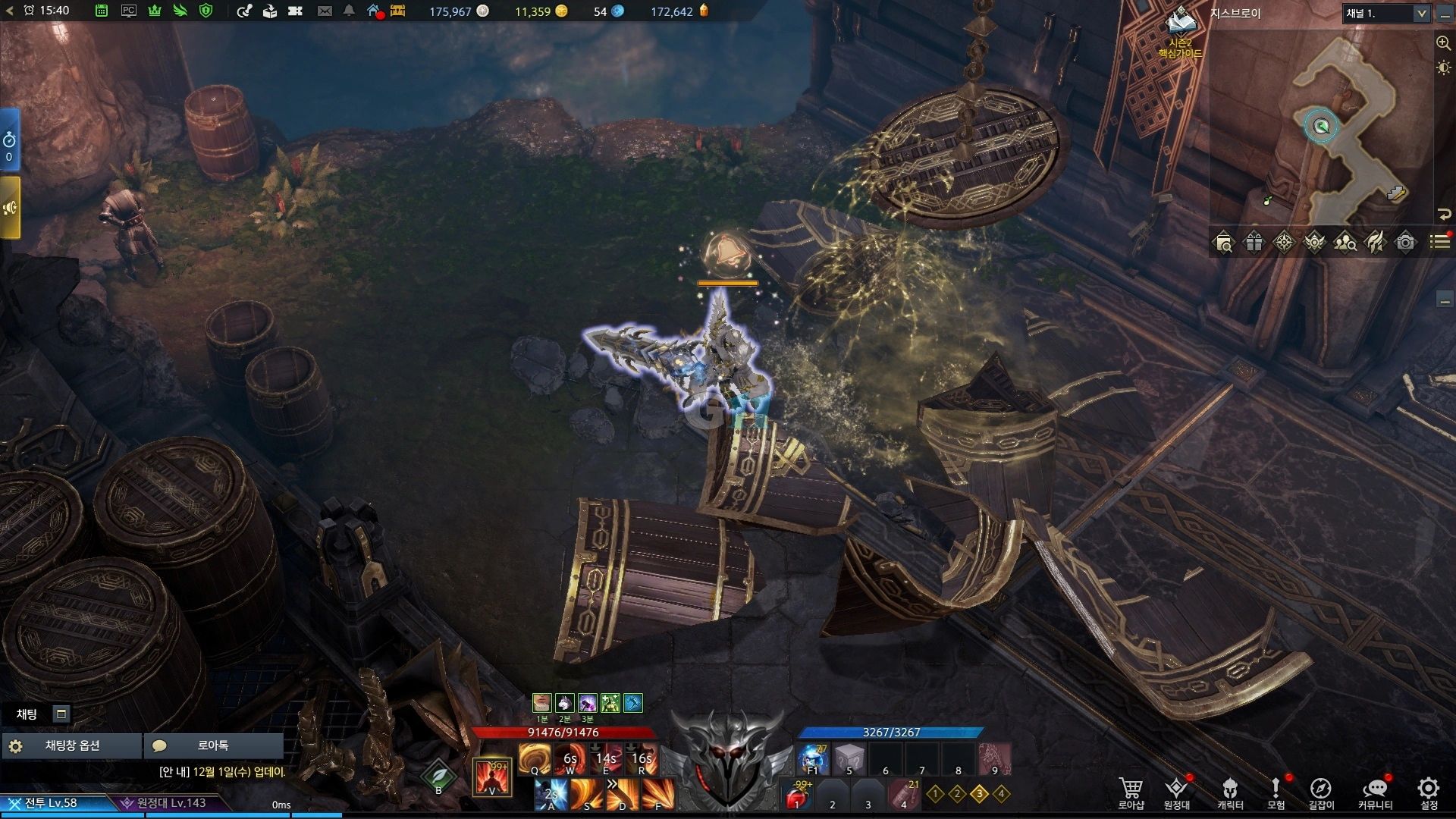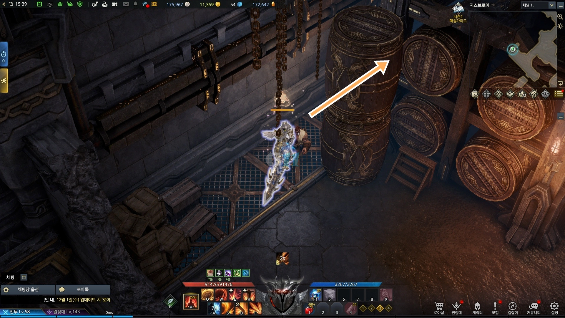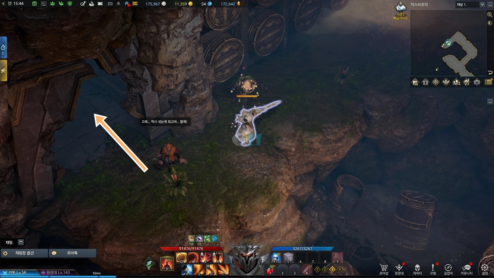 12시 방향으로 빠르게 이동하여 평타와 타수가 많은 스킬을 이용해 커다란 술통을 빠르게 부숴줍니다. 부수고 나서 11시 방향 바로 위로 걸어가면 숨겨진 지역으로 이동합니다. (미니맵 상 1시 방향 샛길 아님 주의)