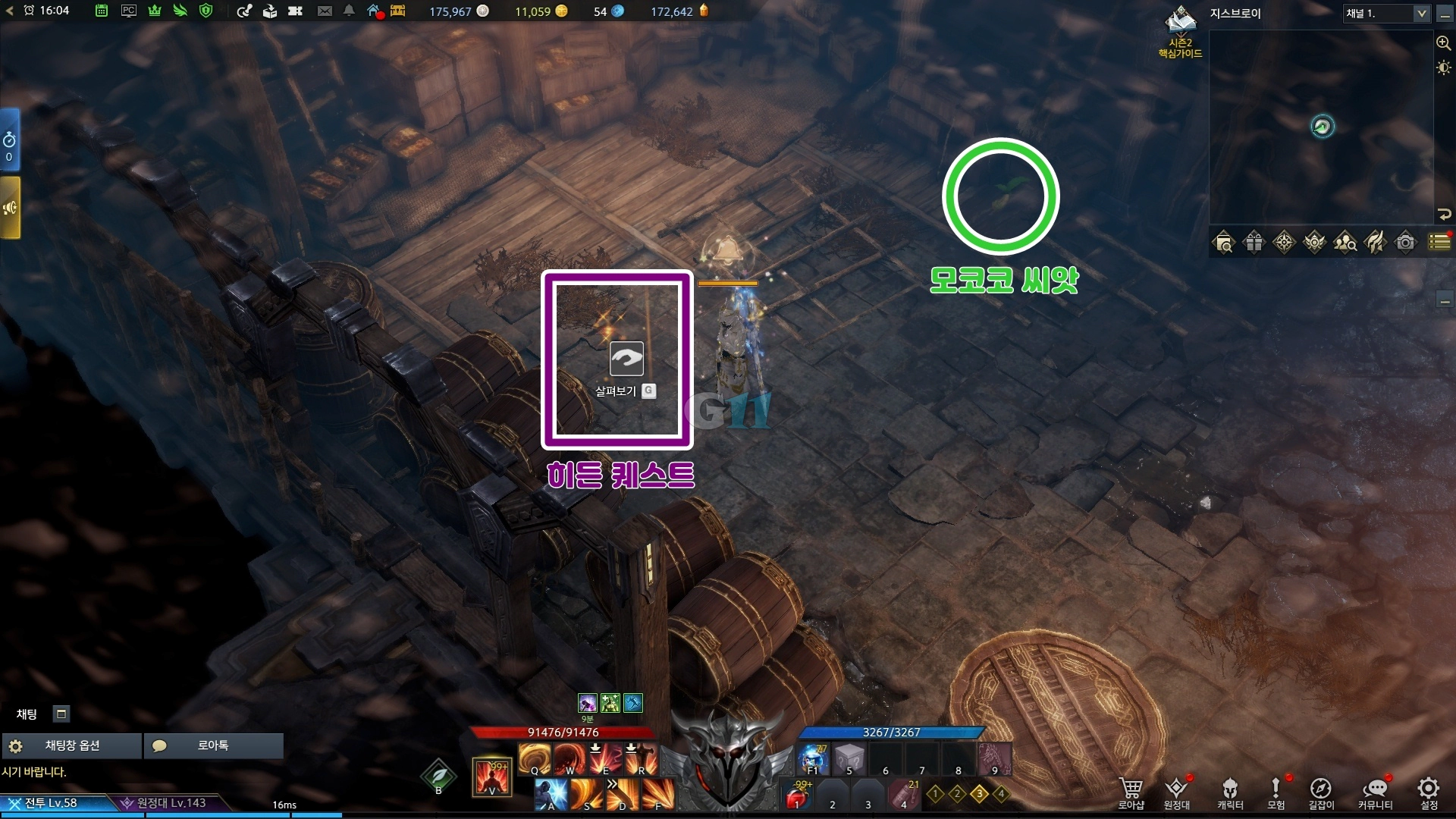12시와 9시 방향 술통 뒤에 숨어있는 모코코 씨앗 2개를 획득하고 빠르게 히든 퀘스트를 진행해야 합니다. 히든 퀘스트를 진행하려면 '놀라운 술기운' 버프가 필요하며 만약 버프가 끝났다면 다시 골든벨을 울리고 버프를 획득해야만 진행 가능합니다.