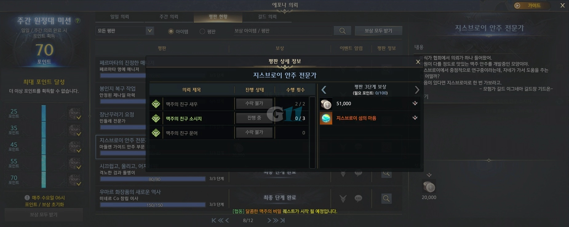 지스브로이 섬의 마음은 에포나 의뢰 평판 3단계 보상으로 얻을 수 있으며 번거롭기 때문에 이벤트로 얻은 에포나 의뢰 즉시 완료권을 사용해 완료하는 것을 추천합니다. 지스브로이 협동 퀘 시간, 에포나 시간은 이번 패치로 매 시 20분에 진행할 수 있으며 컨텐츠 알림에서 확인할 수 있습니다. 협동 퀘스트를 진행하면 얻을 수 있는 재료 바구니 개수는 3개로 매 타임 최대 15개를 획득할 수 있습니다.