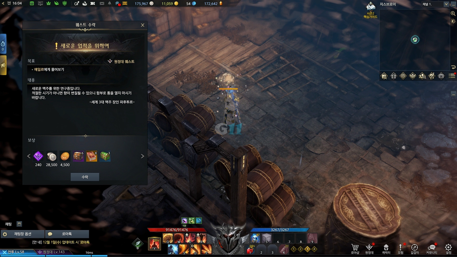 숨겨진 지역에서 술통에 다가가면 술 만난 술고래#1 숨겨진 이야기를 진행할 수 있습니다. 획득 후 숨겨진 방에서 나가고 위쪽 샛길로 달려갑니다. (지스브로이 흐르는 소리)