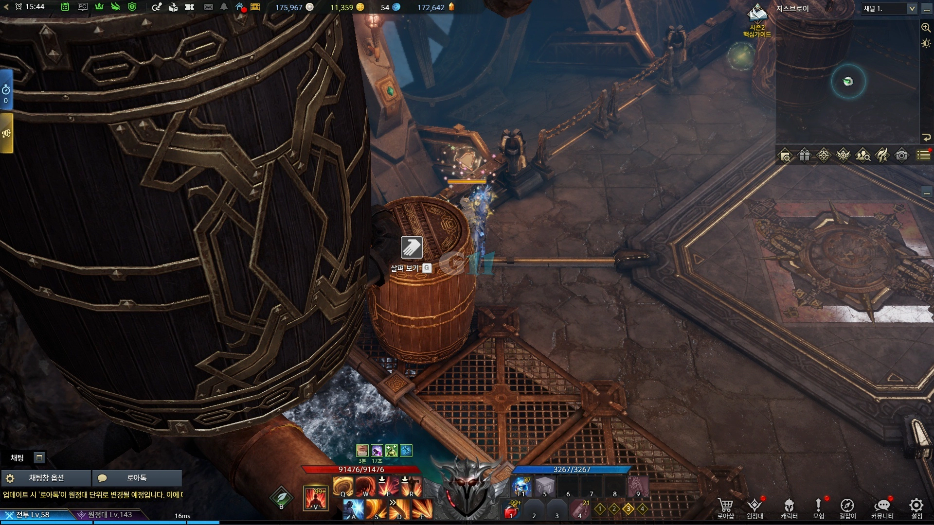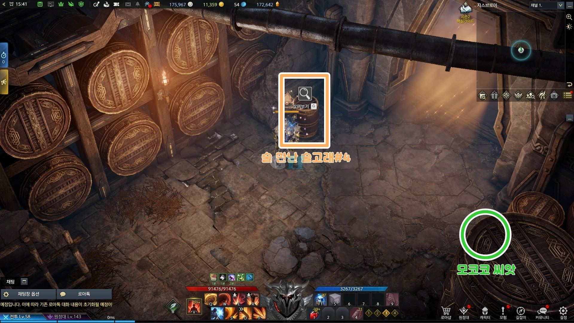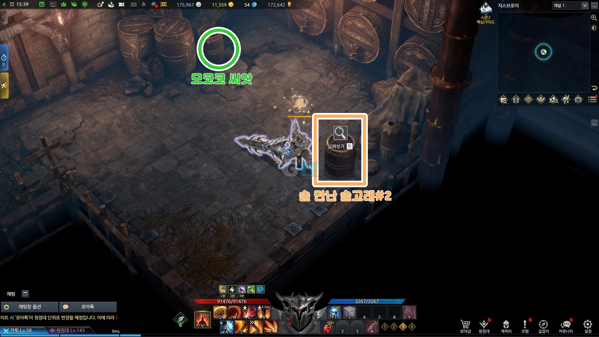 위로 올라오면 술통 마시기 상호작용을 진행할 수 있는데 아래 버프 창을 확인해 '술기운' 버프를 15 중첩 쌓아 만치도치 버프를 활성화합니다. 만치도치 버프는 5분 간 지속되며 모코코 내부에서 모코코 씨앗을 획득하는데 필요합니다. 버프 획득 후 지하로 바로 이동합니다.