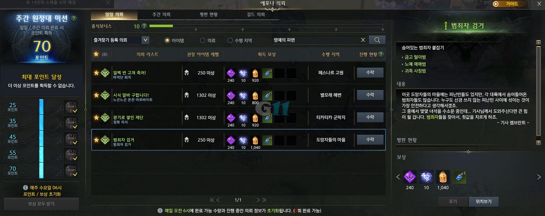 | 추천 순위 | 에포나 의뢰 | 필요 | 보상 |