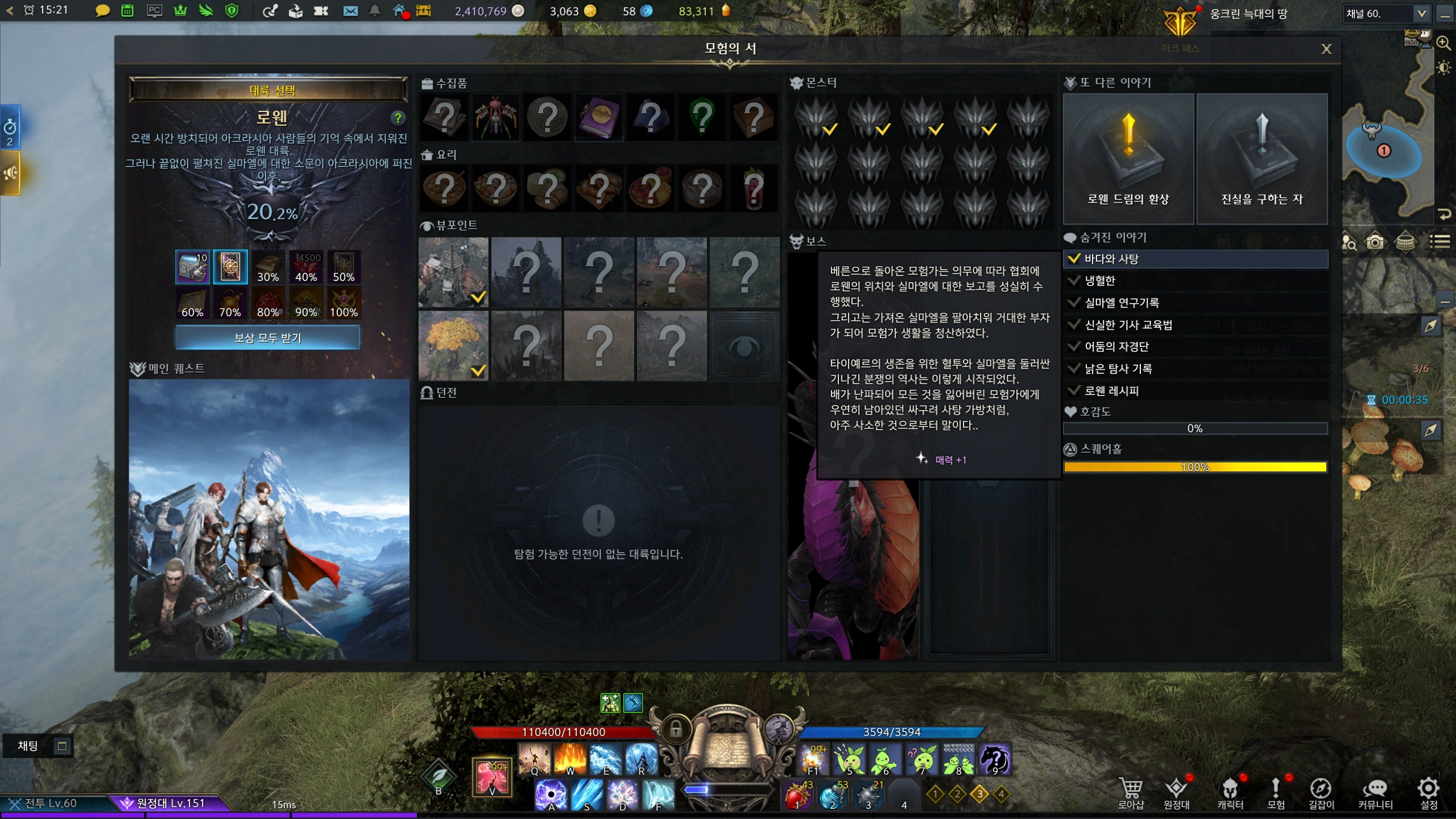 2021년 12월 29일 출시된 신규 대륙 로웬 모험의 서 공략을 소개합니다. 모험의 서를 쌓으려면 메인 퀘스트는 물론, 지역의 필드 보스, 몬스터 처치 후 드롭되는 수집품, 정예 몬스터 처치, 또 다른