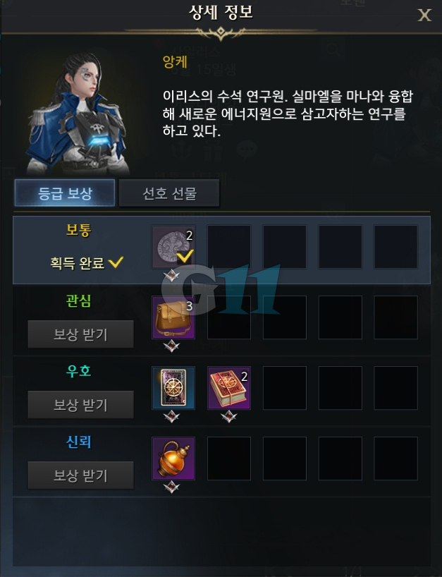 앙케에게 얻을 수 있는 주요 등급 보상은 관심 등급 달성 시 명예의 전투 각인서 주머니 3개로 확률로 전설 각인서를 얻을 수 있습니다. 신뢰 등급 달성 시 상급 체력 증가 물약도 얻을 수 있습니다.